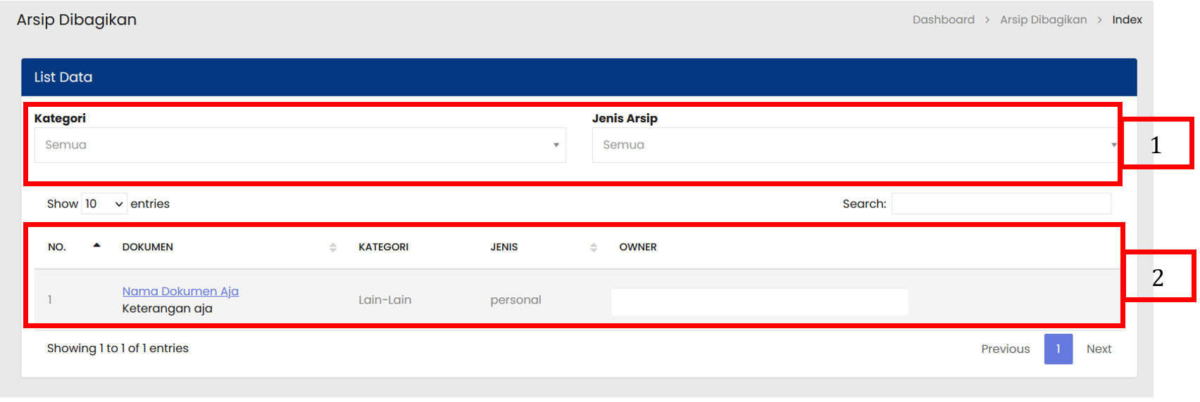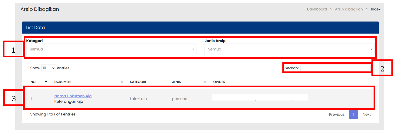 Setelah submenu Arsip dibagikan dipilih, maka akan muncul halaman Arsip dibagikan |