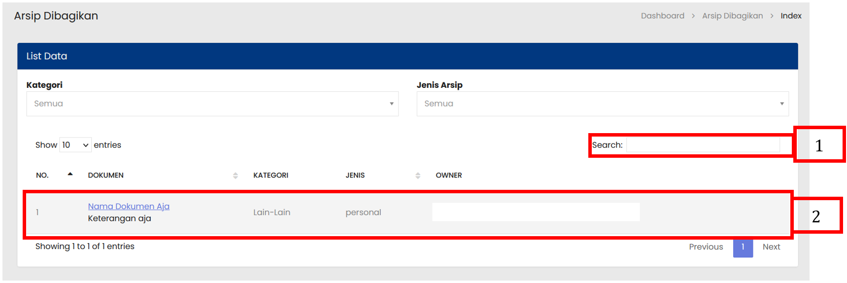 Sistem akan menampilkan daftar Arsip dibagikan sesuai dengan kata kunci yang dimasukkan |