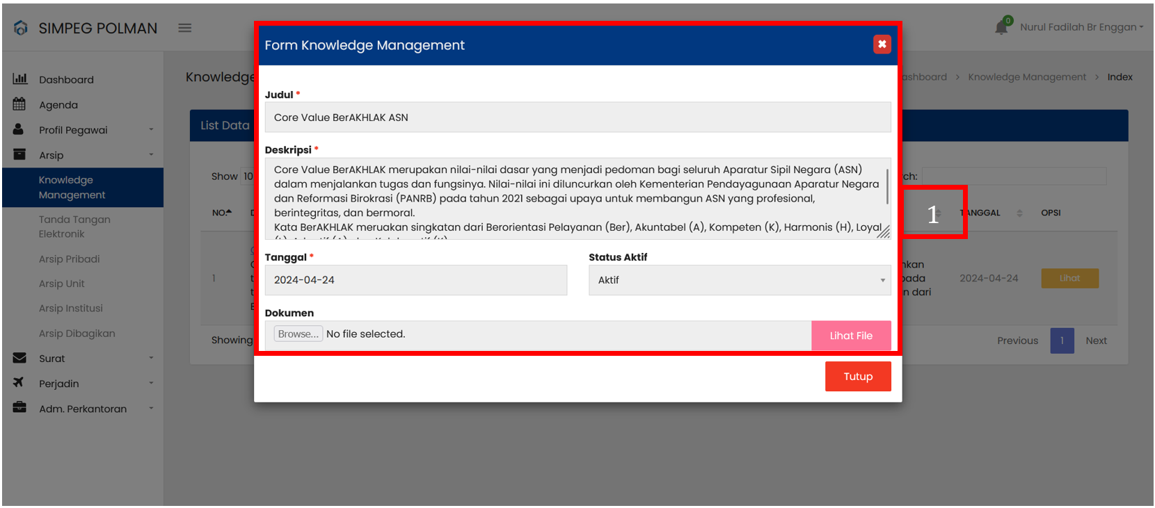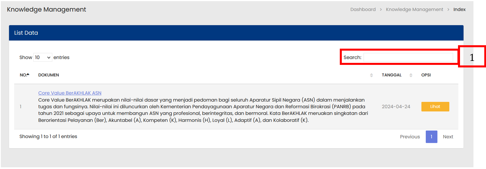 Tabel Knowledge Management menampilkan daftar seluruh Knowlegde Management yang sudah terdaftar |