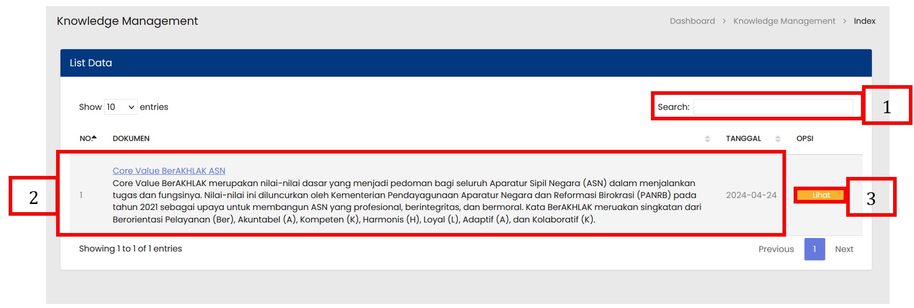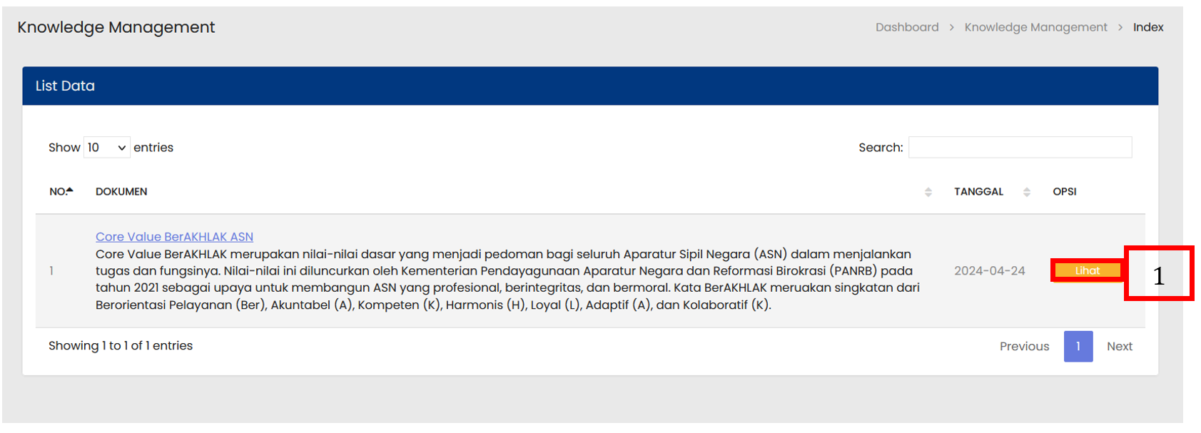 Tombol Lihat digunakan untuk melihat rincian dari Knowlegde Management yang dipilih |