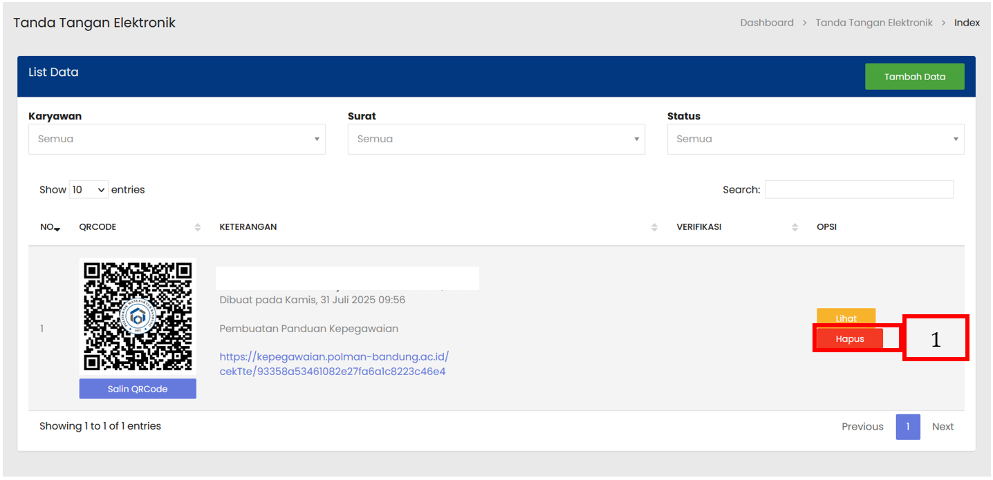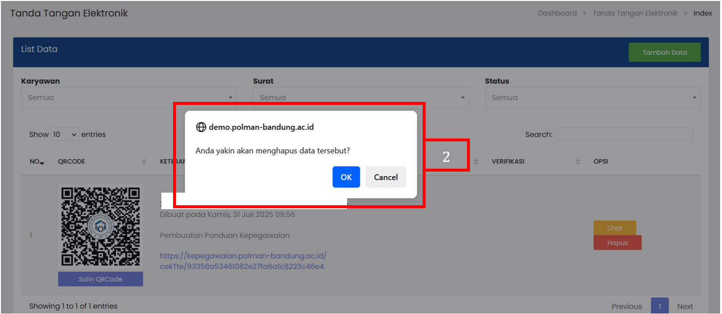 Pilih tombol Hapus pada baris data Tanda Tangan Elektronik yang ingin dihapus |