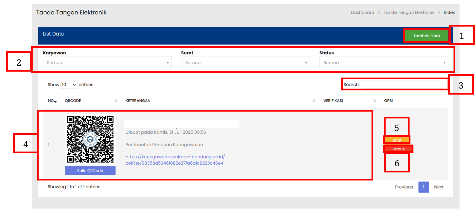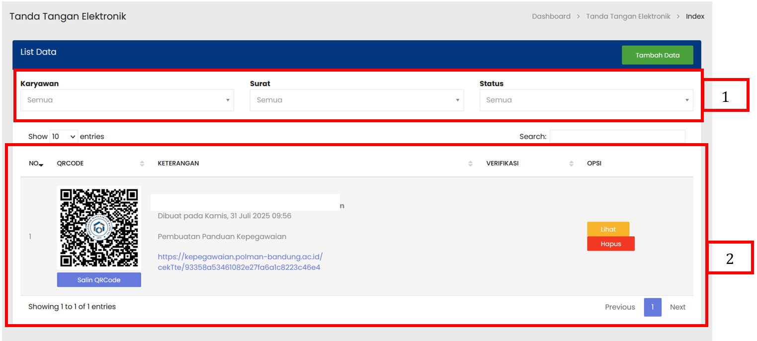 Tabel Tanda Tangan Elektronik menampilkan daftar tanda tangan elektronik yang sudah terdaftar |