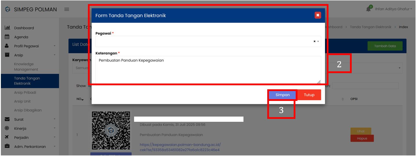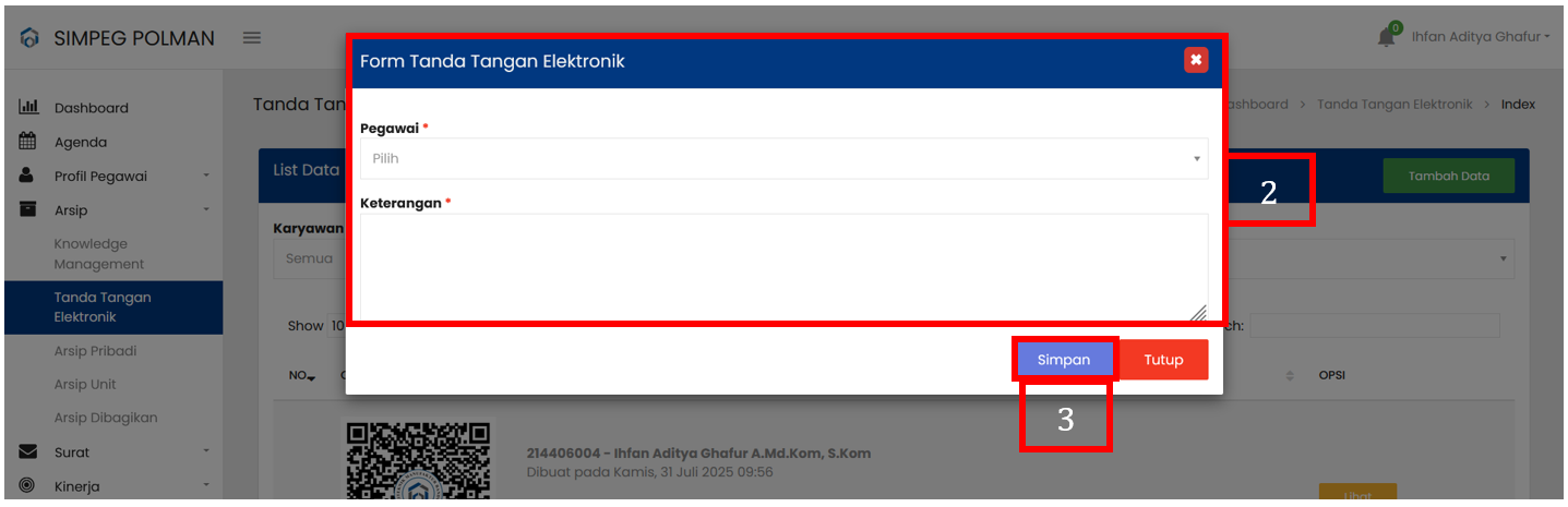 Berikut ini Langkah-langkah mennambah data Tanda Tangan Elektronik: