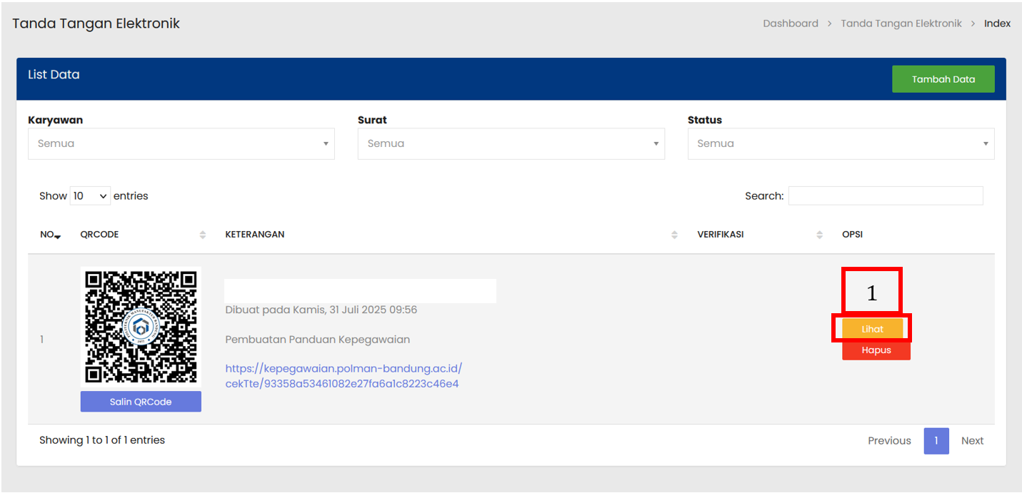 Sistem akan menampilkan daftar Tanda Tangan Elektronik sesuai dengan kriteria yang sudah dimasukkan |
