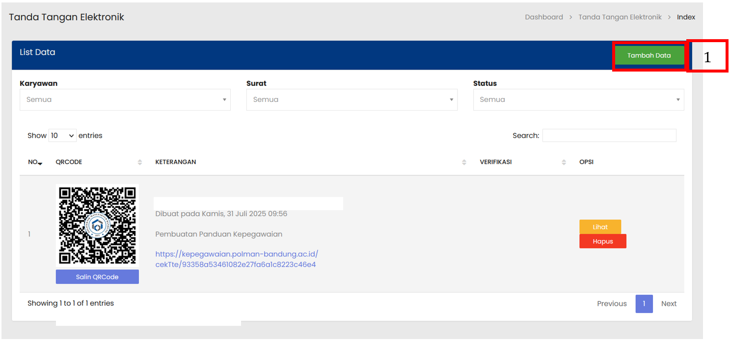 Pilih tombol Tambah Data untuk menampilkan form penambahan Tanda Tangan Elektronik baru |