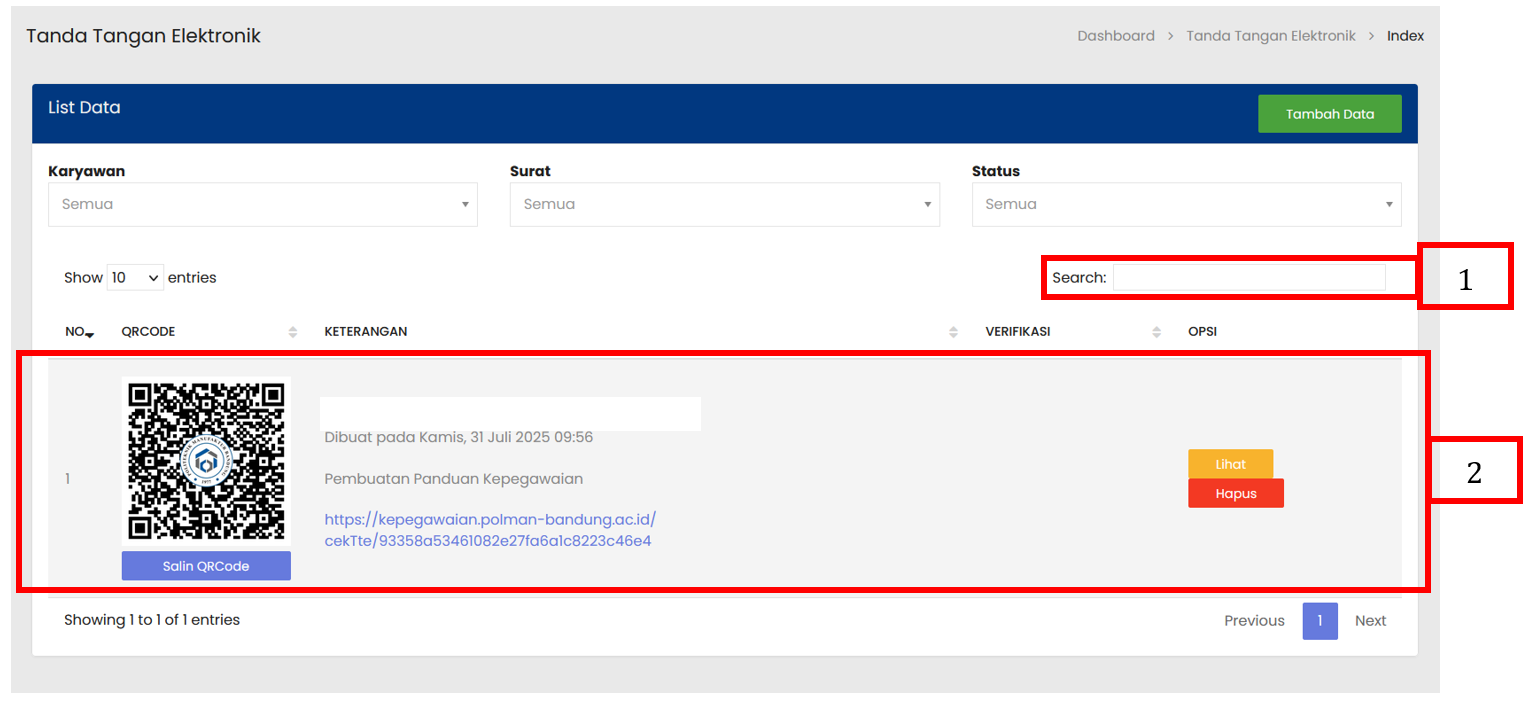 Sistem akan menampilkan daftar Tanda Tangan Elektronik sesuai dengan kata kunci yang dimasukkan |