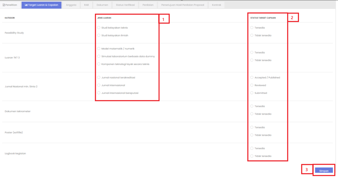 Setelah tombol Simpan diklik maka dapat dilanjut ke pengisian halaman Target Luaran & Capaian:
