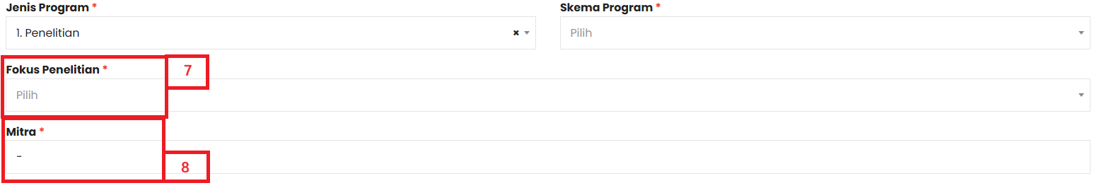 | 8 | Diisi dengan nama Mitra (tidak wajib untuk Jenis Program Penelitian) |
