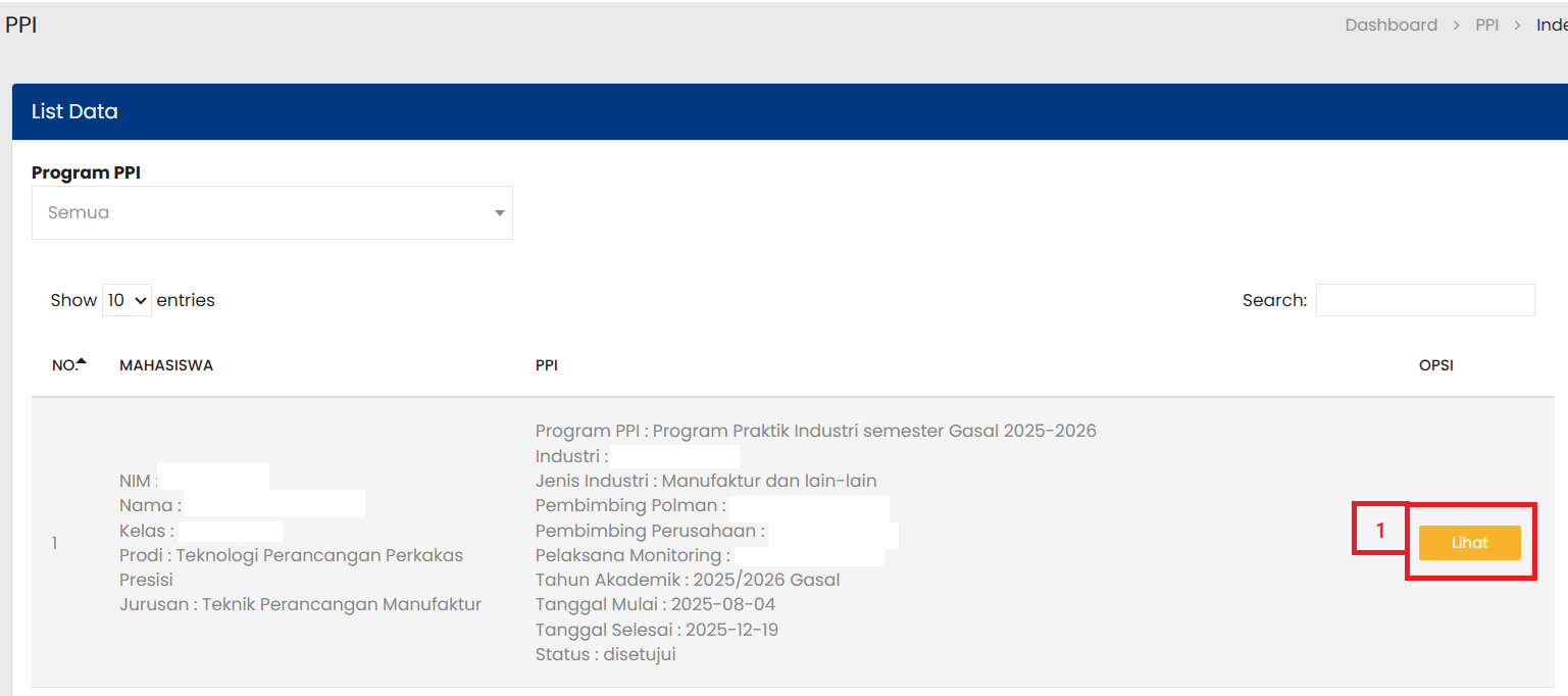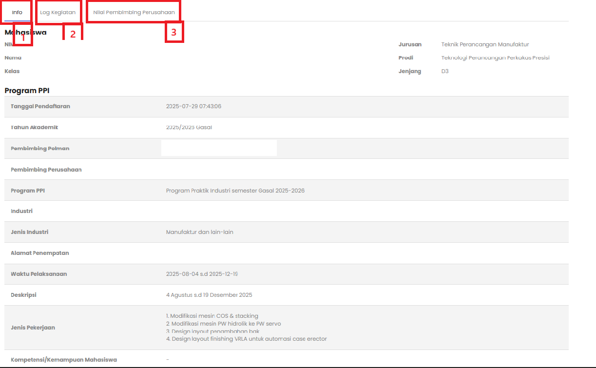 Untuk penilaian kegiatan mahasiswa dapat memilih menu Industri > PPI