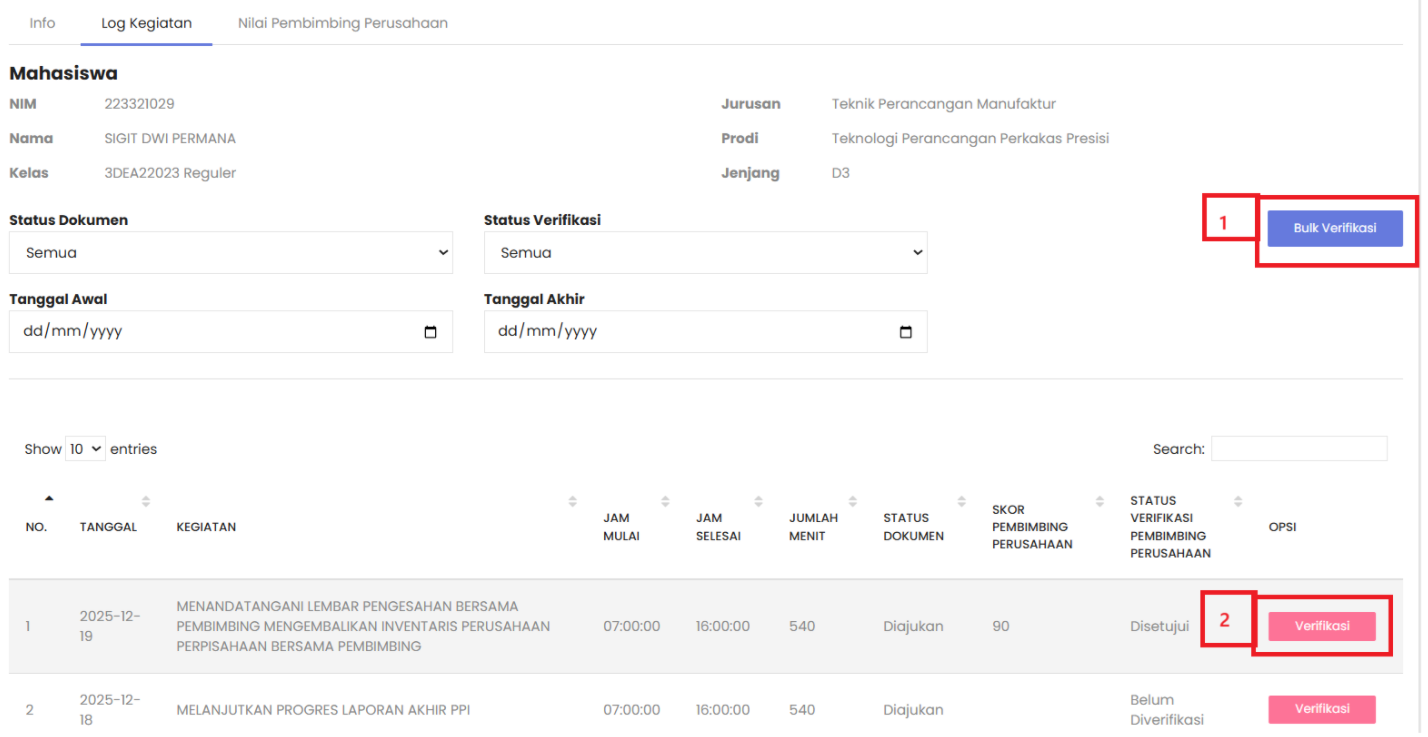 Tombol Verifikasi untuk Memverifikasi 1 Kegiatan Mahasiswa |