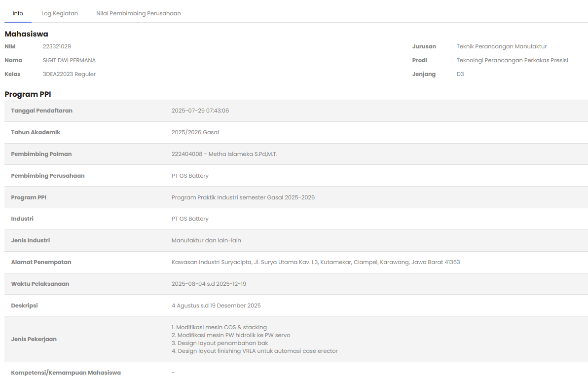 Untuk penilaian kegiatan mahasiswa dapat memilih menu Industri > PPI