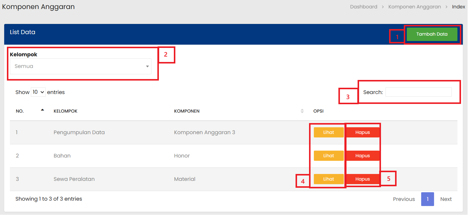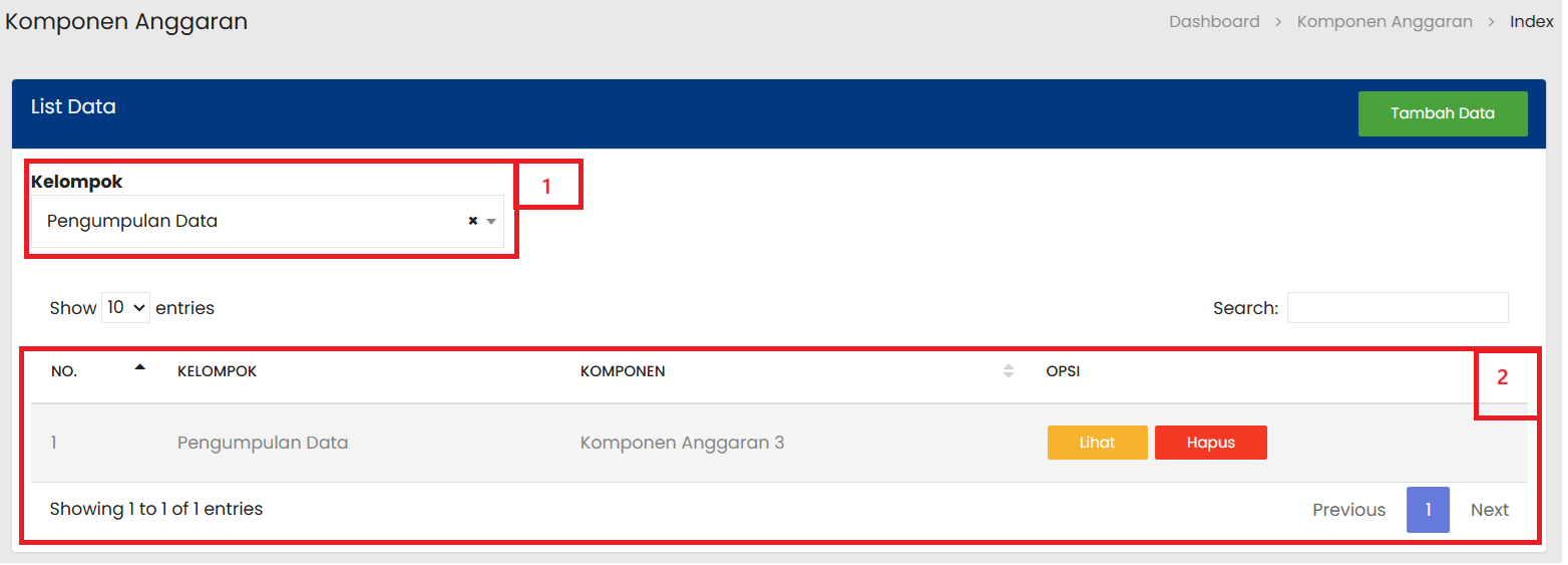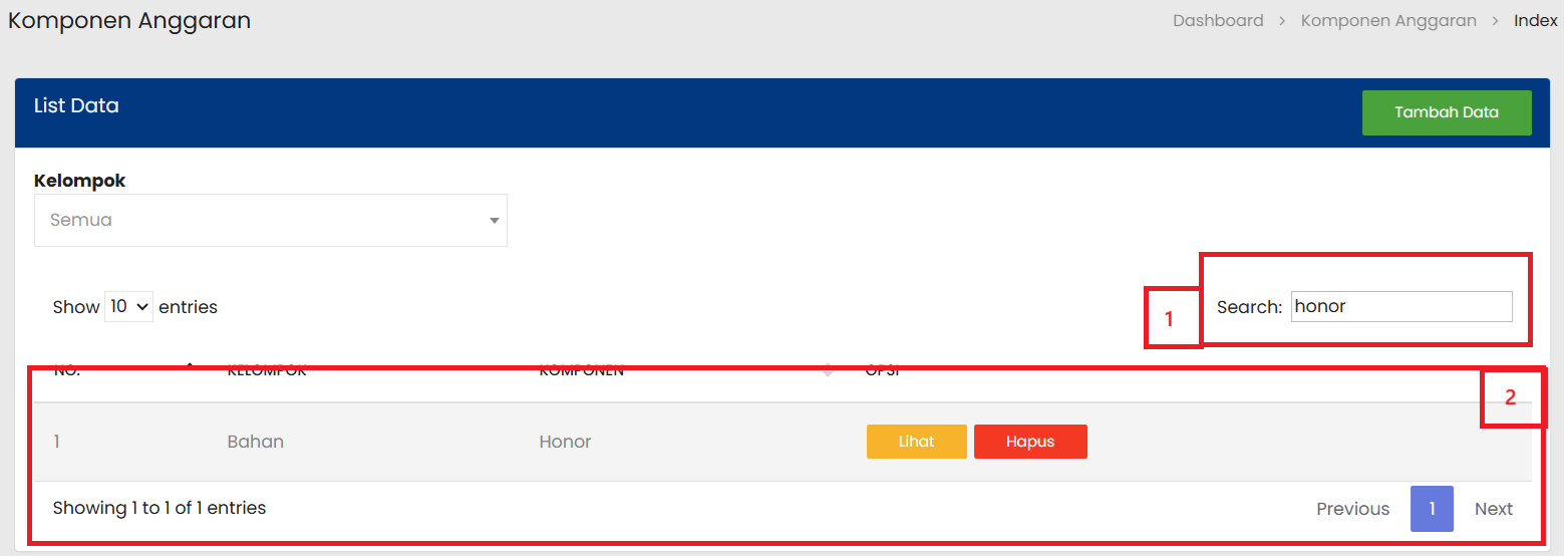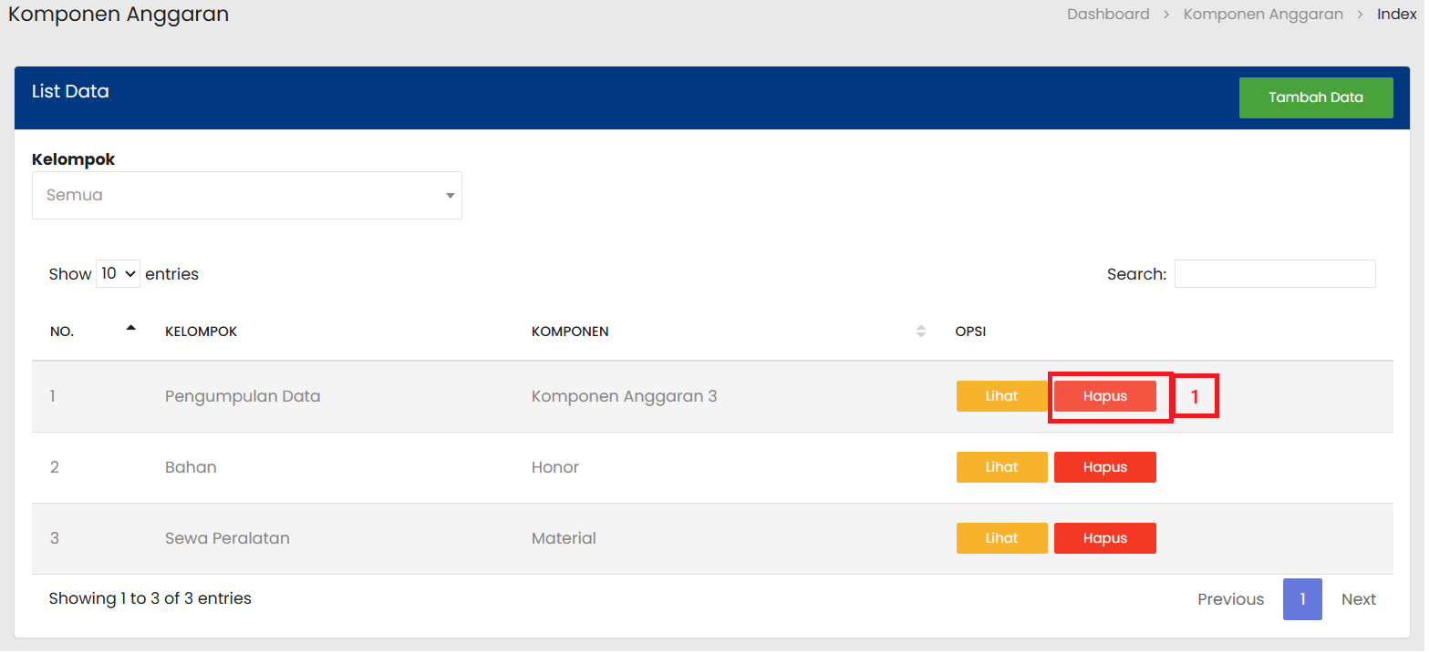 | 1 | Pilih tombol Hapus pada baris data Komponen Anggaran yang ingin dihapus |