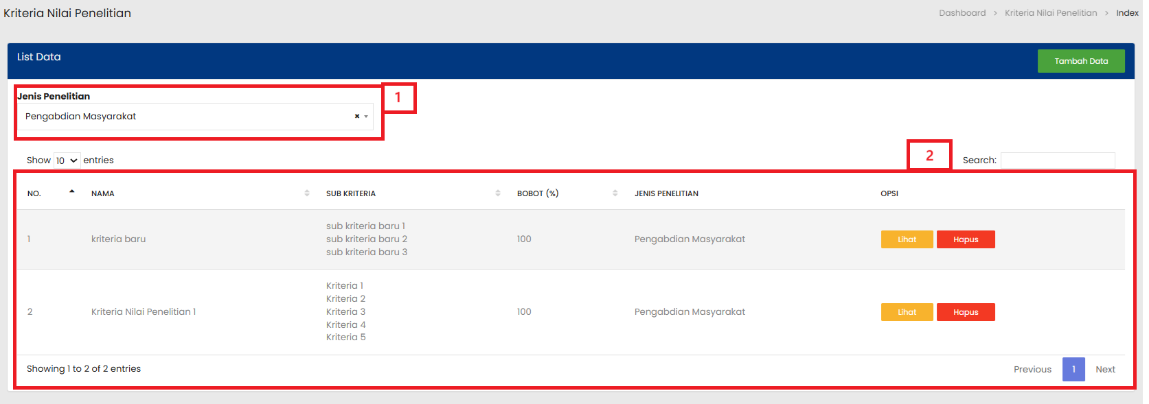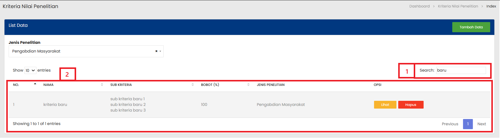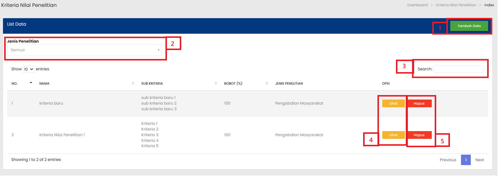 | 4 | Tombol Lihat digunakan untuk melihat atau mengubah rincian dari Kriteria Nilai Penelitian yang dipilih |