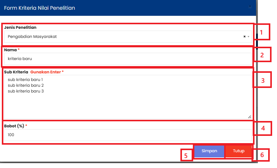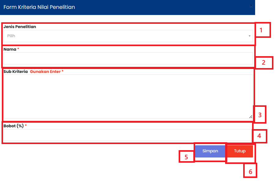 | 5 | Tombol Hapus digunakan untuk menghapus data Kriteria Nilai Penelitian yang dipilih |