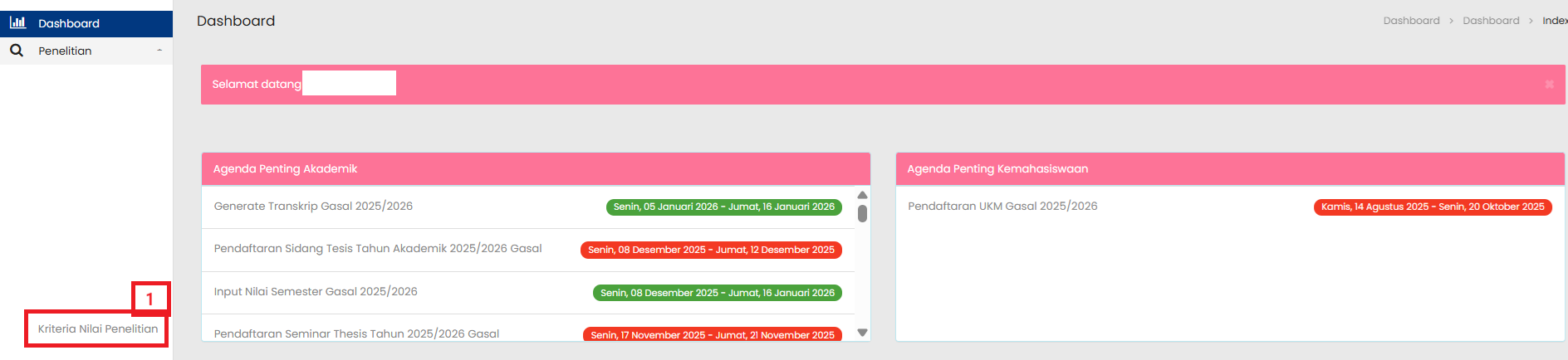| 1 | Klik Kriteria Nilai Penelitian untuk masuk ke halaman Kriteria Nilai Penelitian |