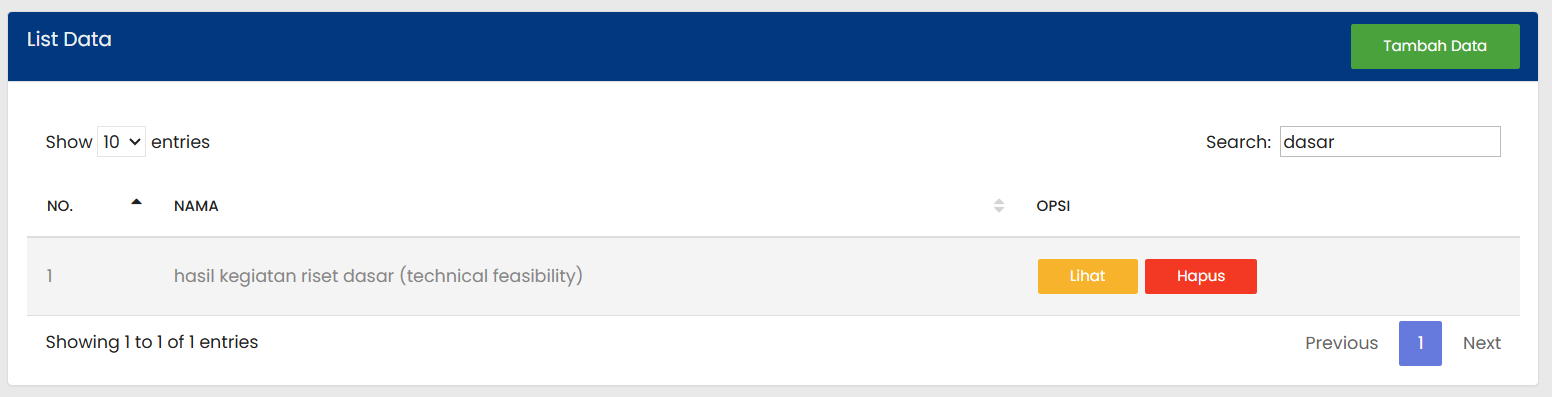 | 2 | Sistem akan menampilkan daftar Jenis Penelitian sesuai dengan kata kunci yang dimasukkan |