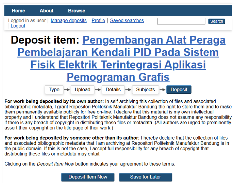 Deposit item adalah proses terakhir utk mengirimkan file anda ke sistem administrator.