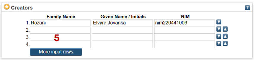 Creators, isikan pengarang dg nama belakang pada kolom “Family Name”. Isikan NIM anda dengan format seperti contoh berikut ini “nim22044100x” . |