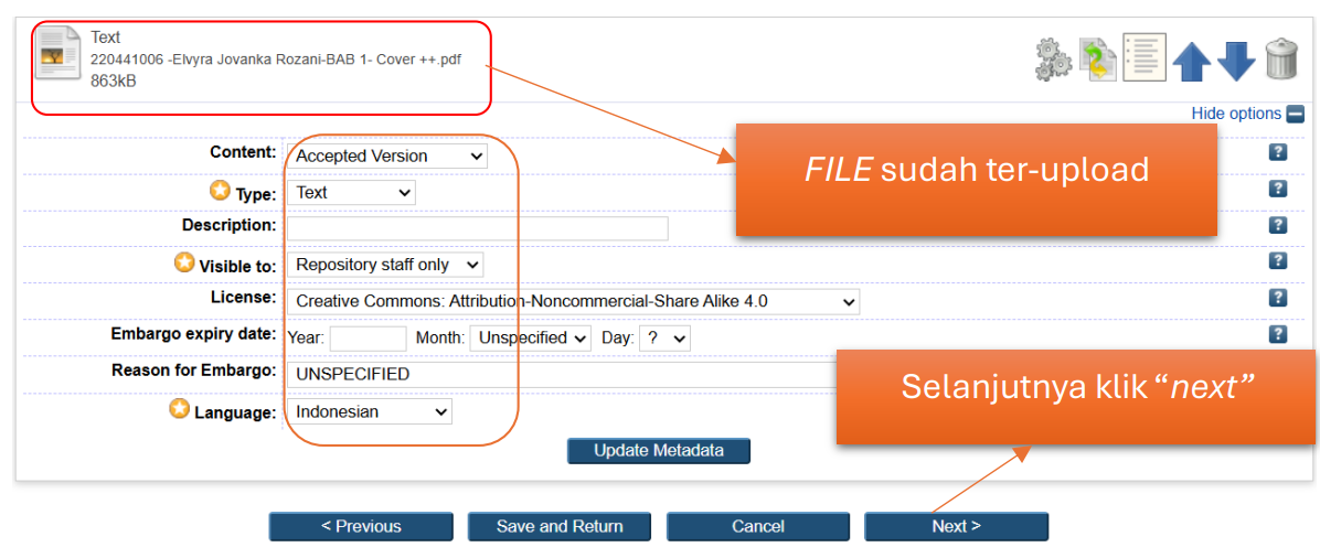 Mahasiswa yang telah melakukan unggah mandiri pada repositori, dilanjutkan dengan mengisi