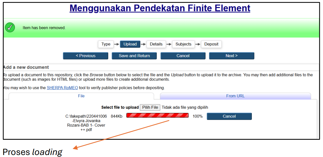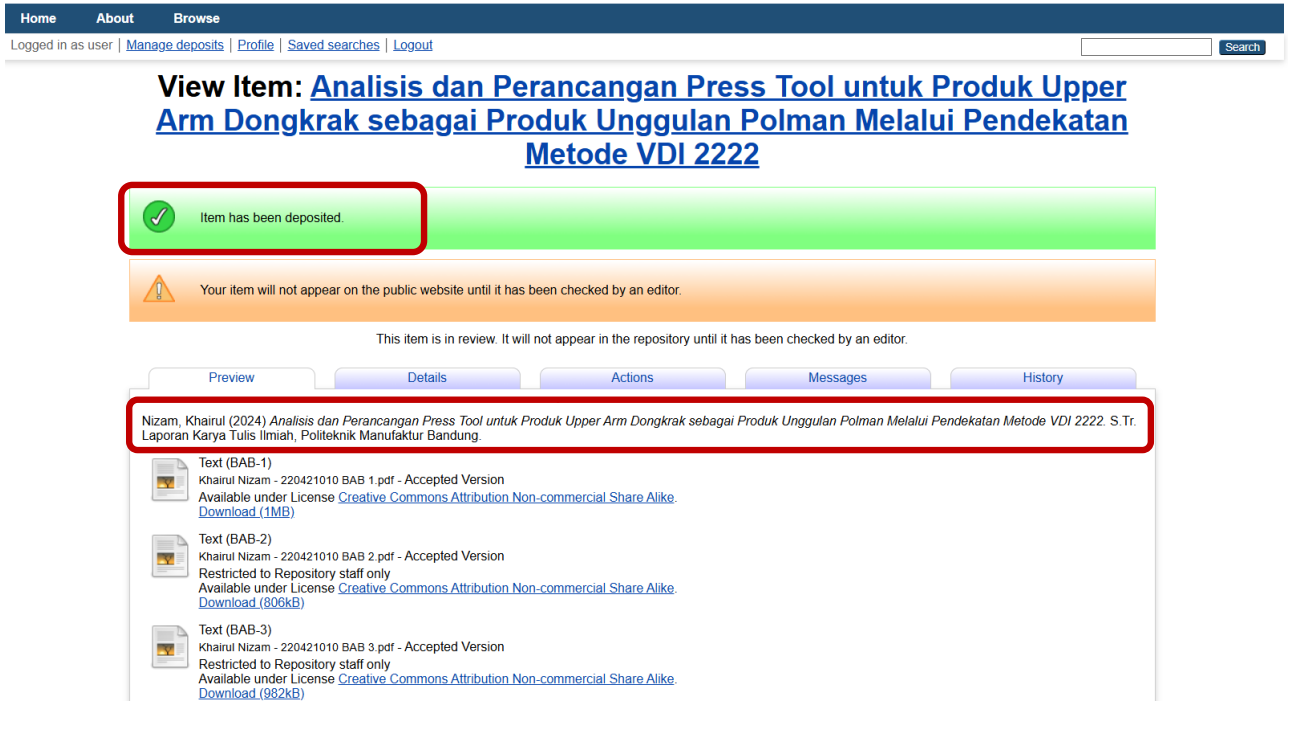 Screen shoot bukti unggah mandiri, tertera “item has been deposited”, tercantum nama