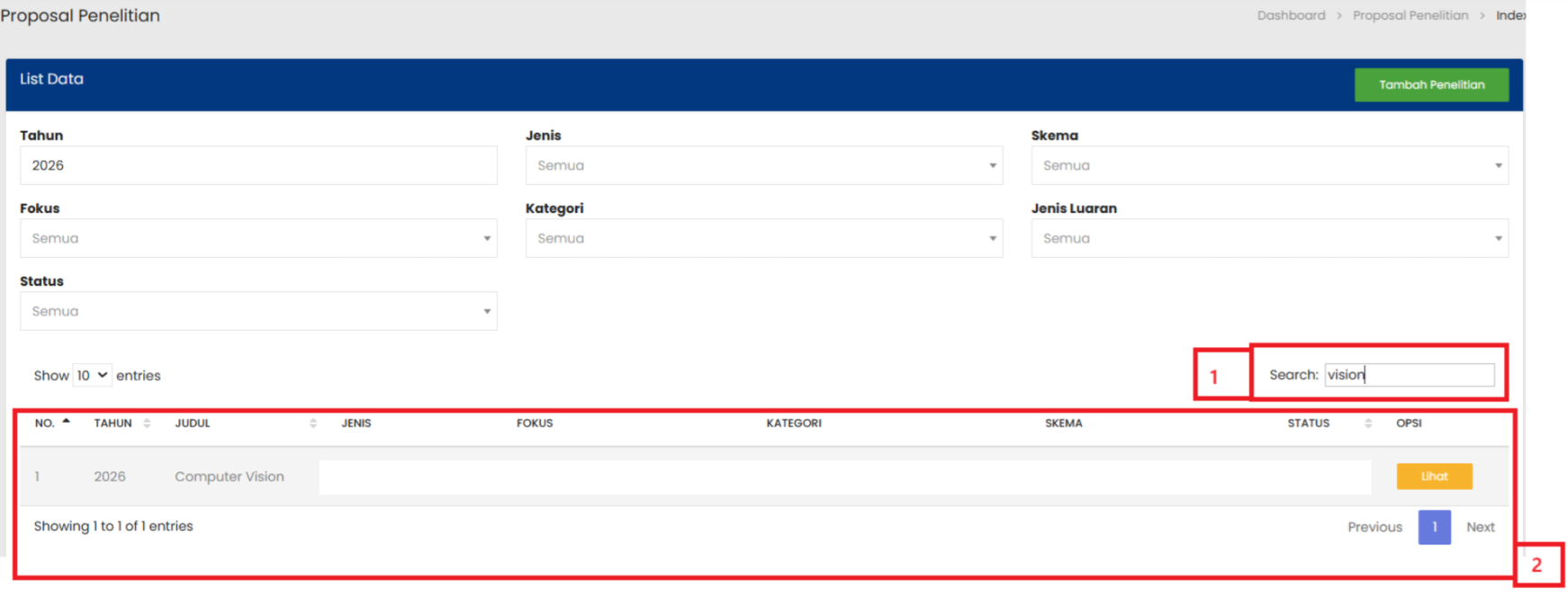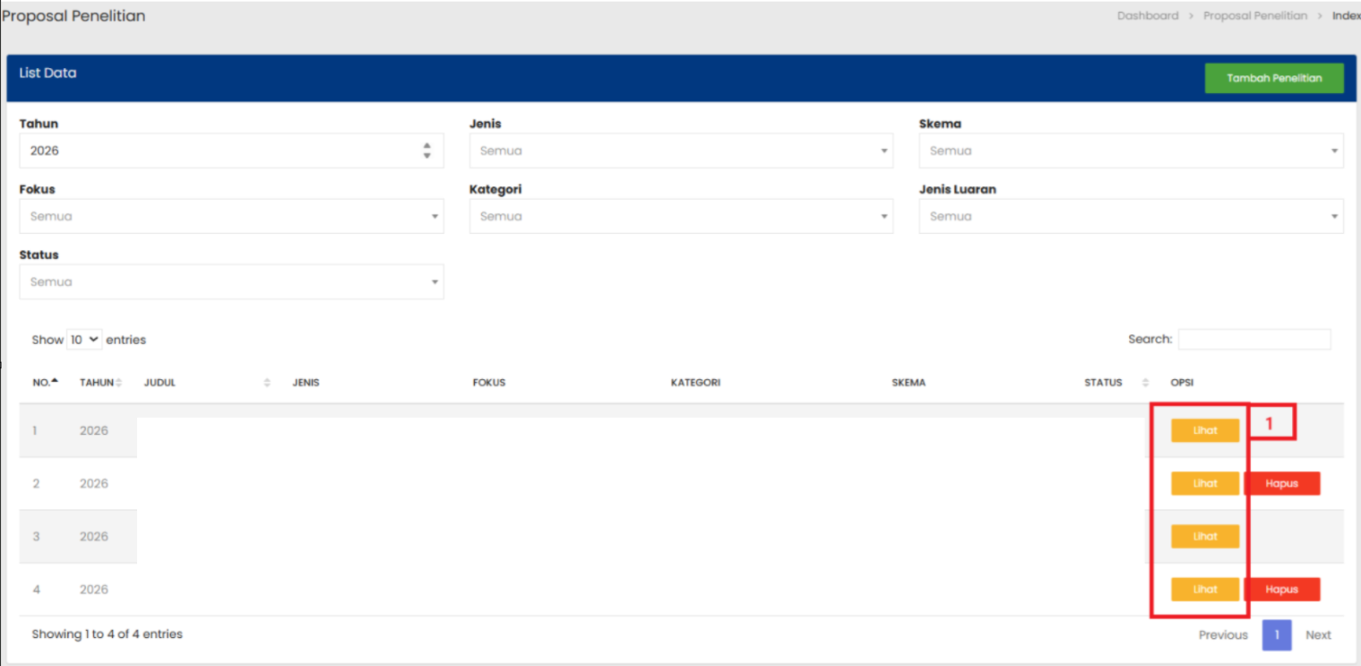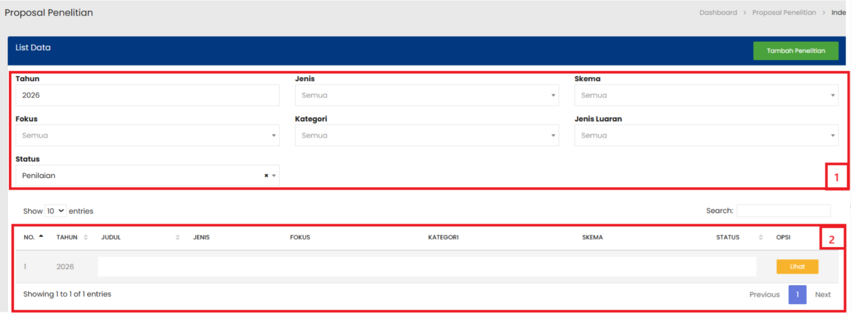 | 1 | Tombol Tambah Penelitian digunakan untuk menampilkan form penambahan data baru |