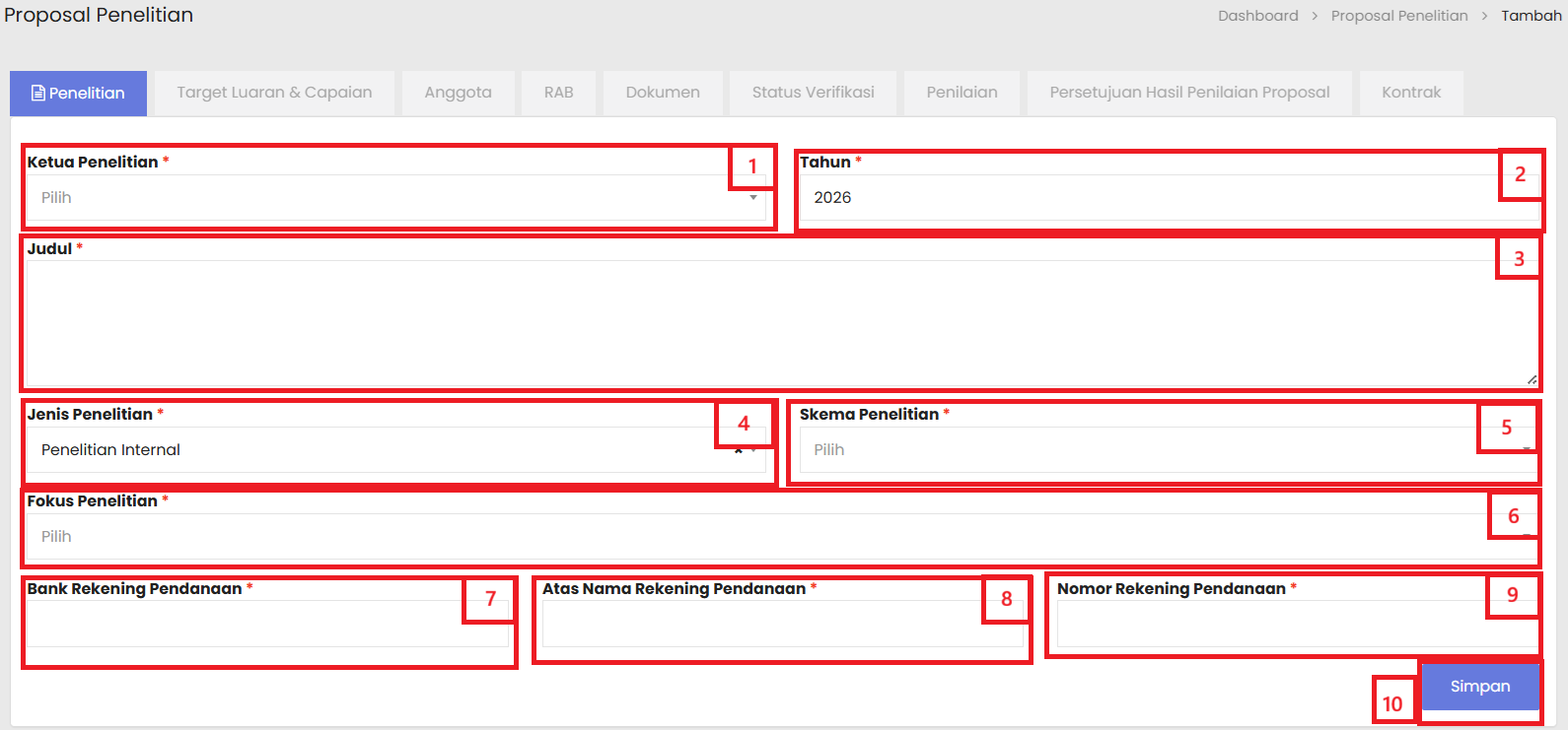 Saat Tombol Tambah Penelitian Diklik, maka akan muncul tampilan seperti berikut: