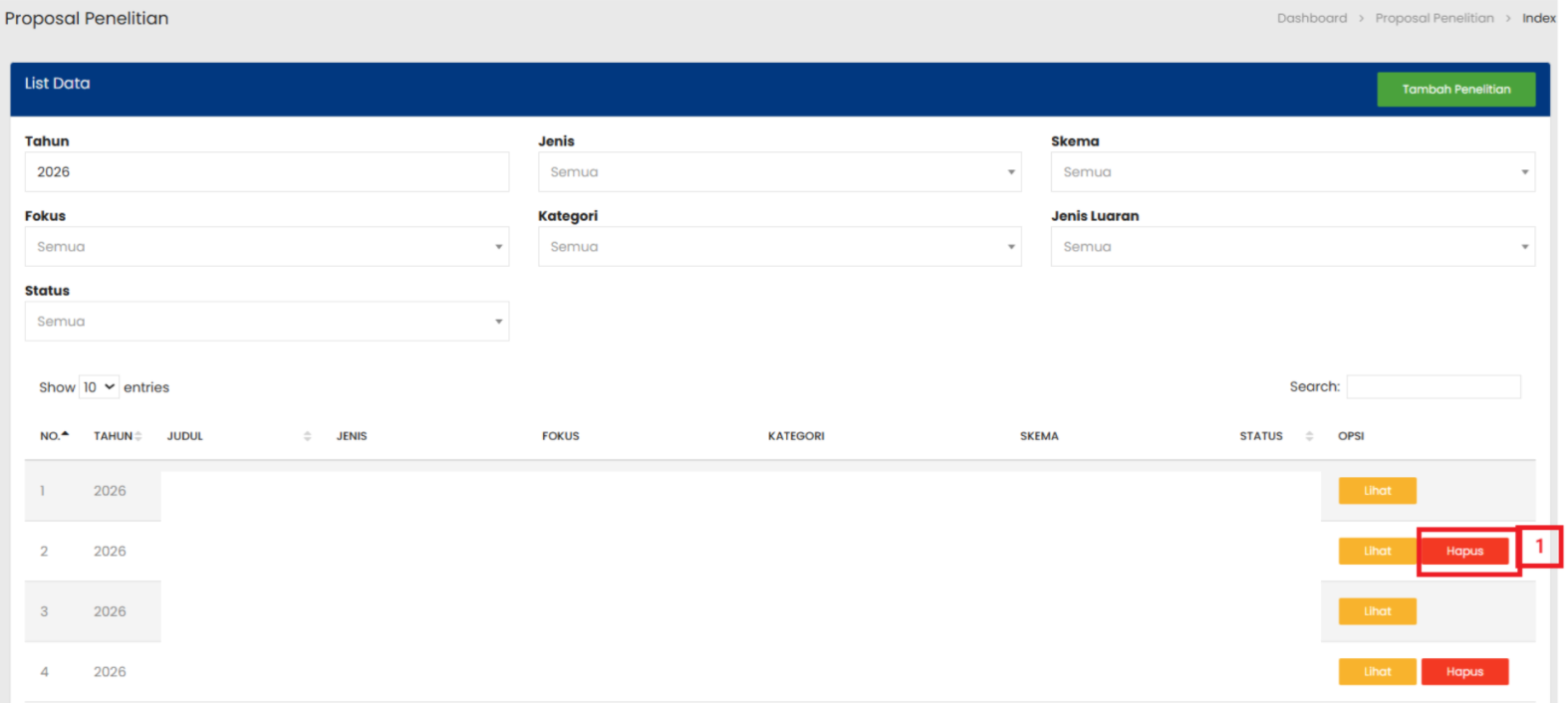 | 1 | Pilih tombol Hapus pada baris data Proposal Penelitian yang ingin dihapus. Pengusul hanya dapat menghapus Proposal Penelitian yang Memiliki Status Draft |
