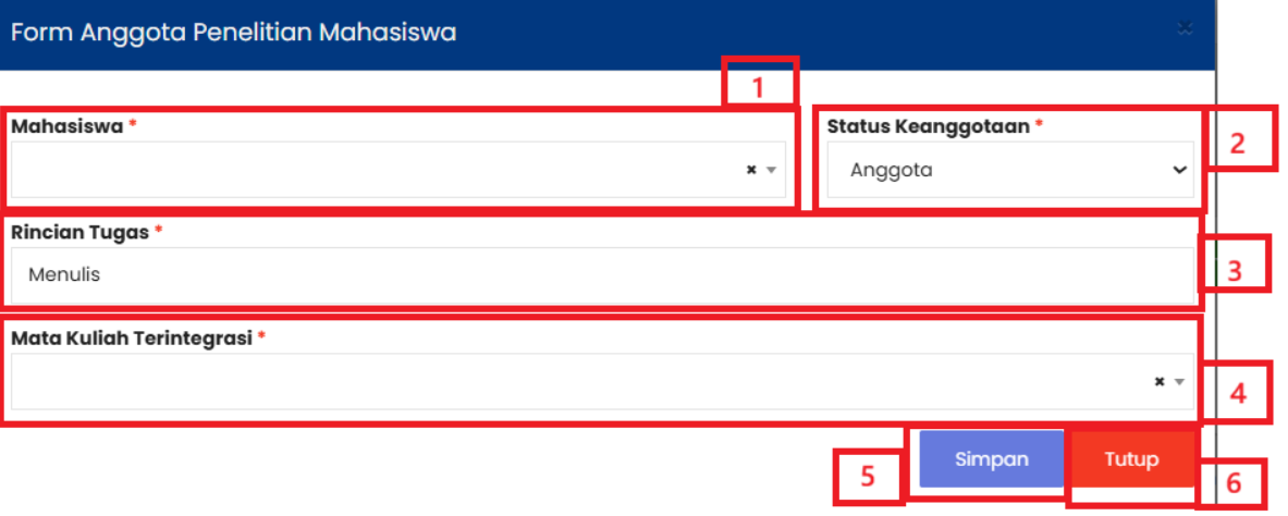 | 1 | Pilih Anggota Penelitian Mahasiswa dari Daftar yang ada |