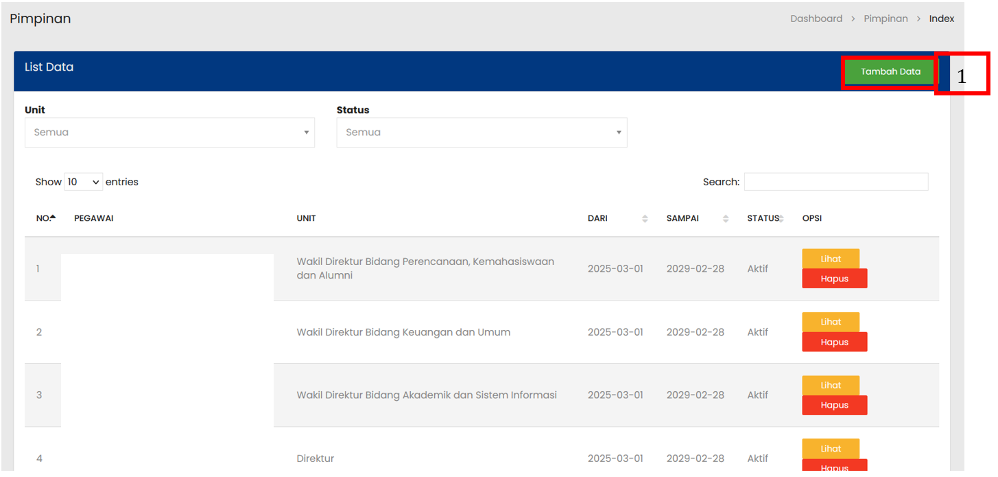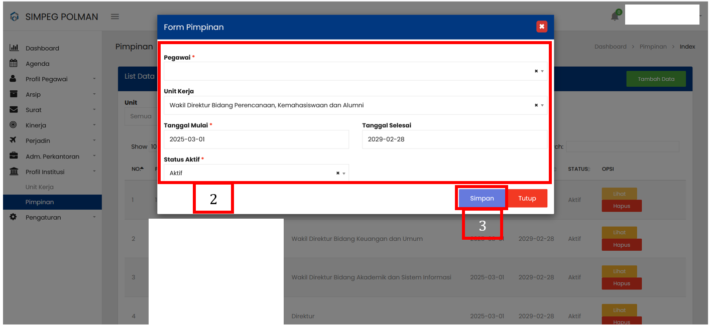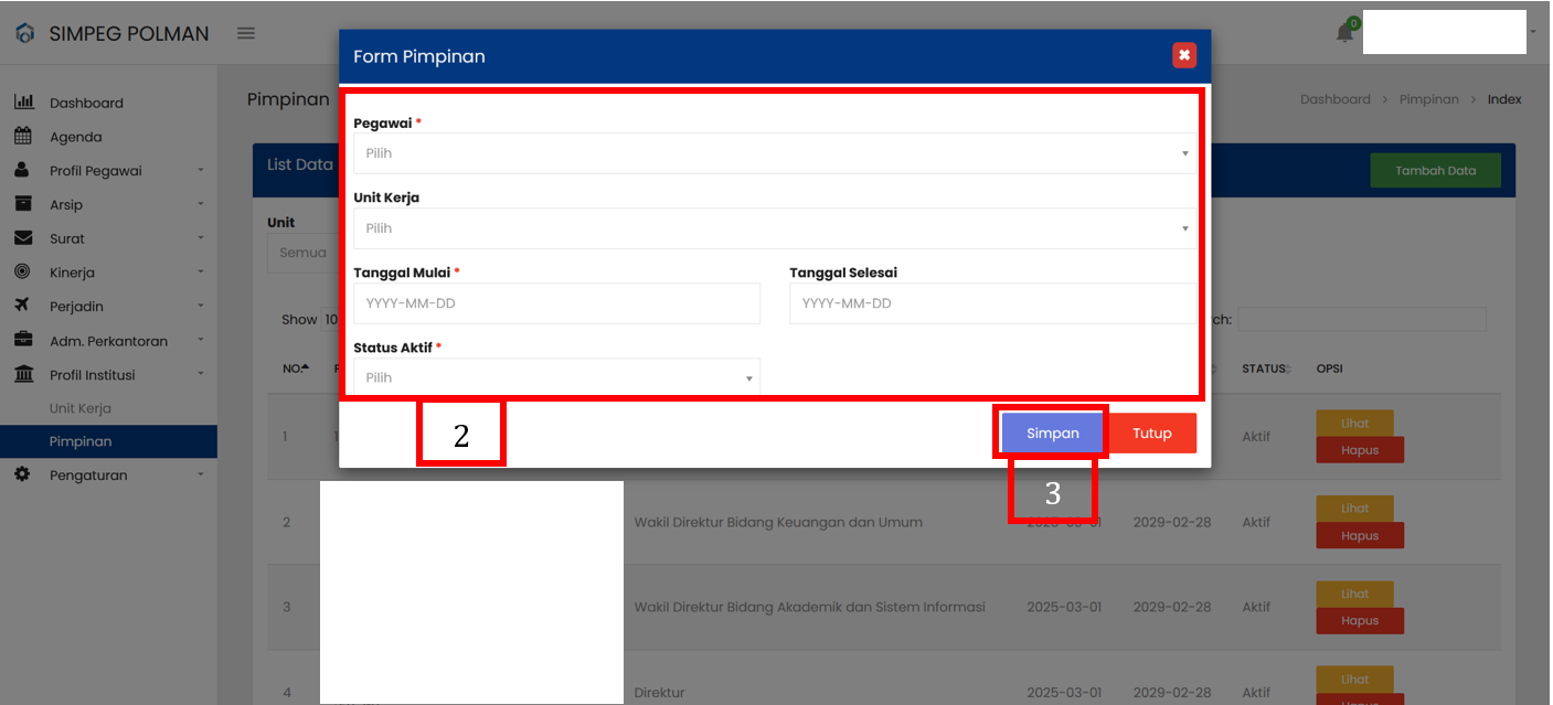 Pilih tombol Tambah Data untuk menampilkan form penambahan Pimpinan baru3 |