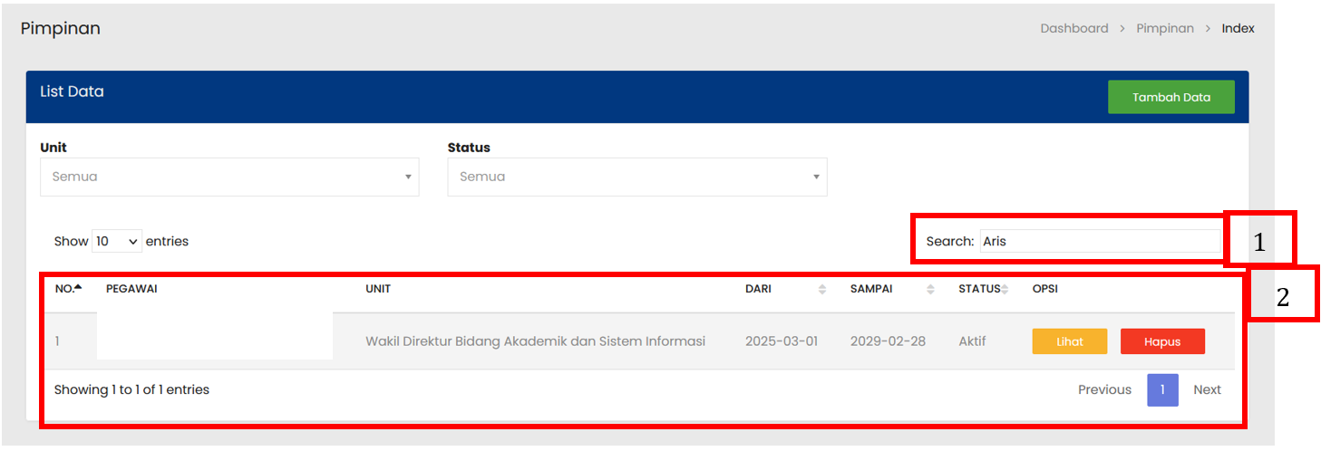 Pada kolom Search, masukan kata kunci (misalnya nama Pimpinan Unit Kerja) |