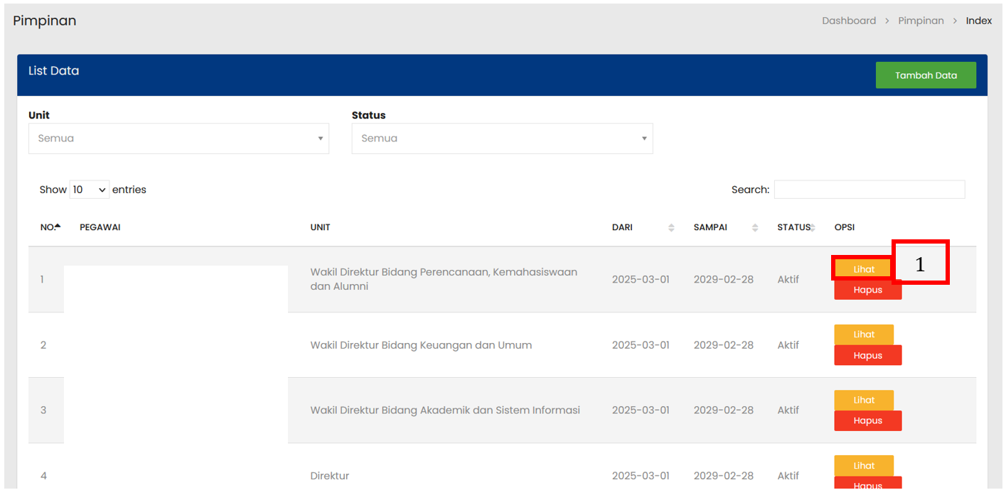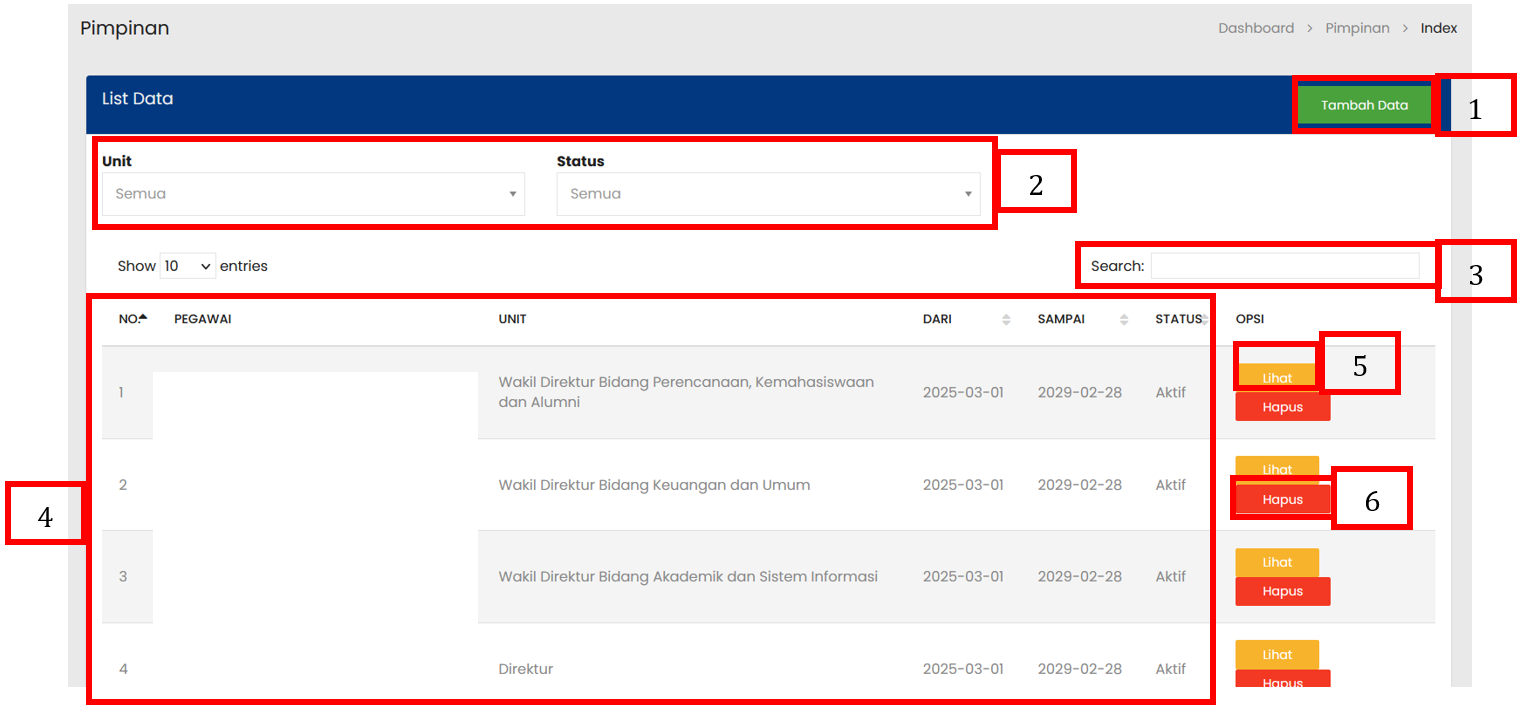 Tabel Pimpinan menampilkan daftar seluruh Pimpinan Unit Kerja yang sudah terdaftar |