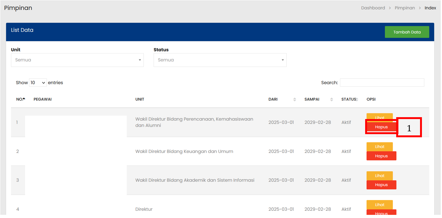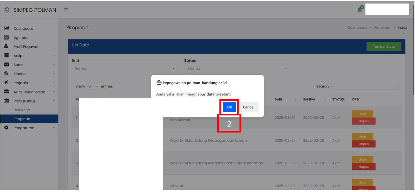 Pilih tombol Hapus pada baris data Pimpinan Unit Kerja yang ingin dihapus |