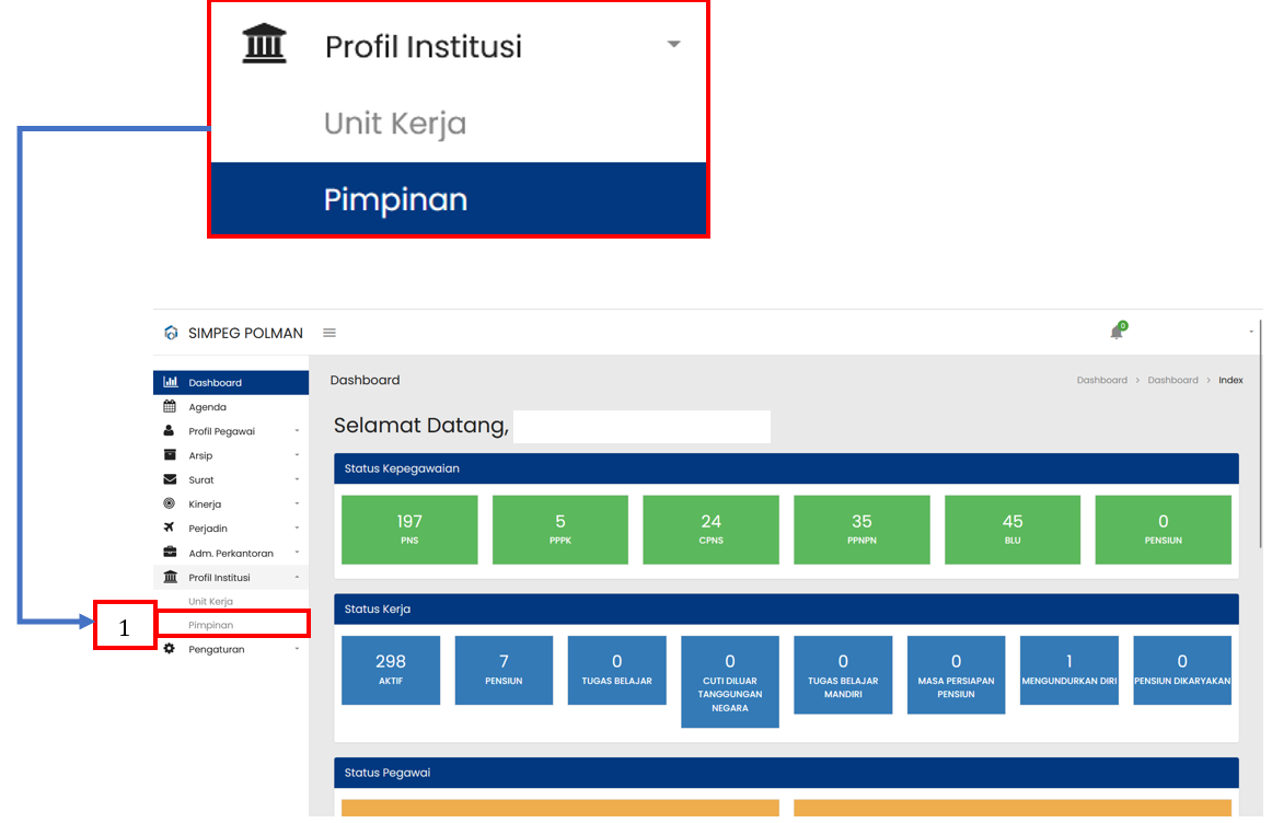 Profil Institusi merupakan salah satu menu dalam Sistem Informasi Kepegawaian yang berisi data mengenai Unit Kerja dan Pimpinan Unit Kerja. Melalui menu ini, Pengelola Kepegawaian dapat melihat, menambahkan, mengubah dan menghapus data Unit Kerja serta Pimpinan Unit Kerja.