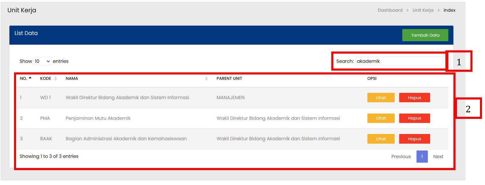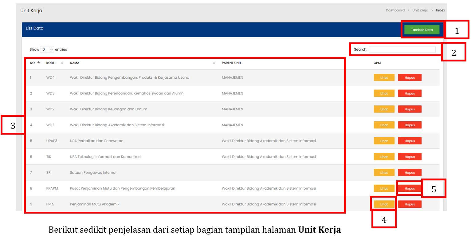 Tabel Unit Kerja menampilkan daftar seluruh Unit Kerja yang sudah terdaftar |