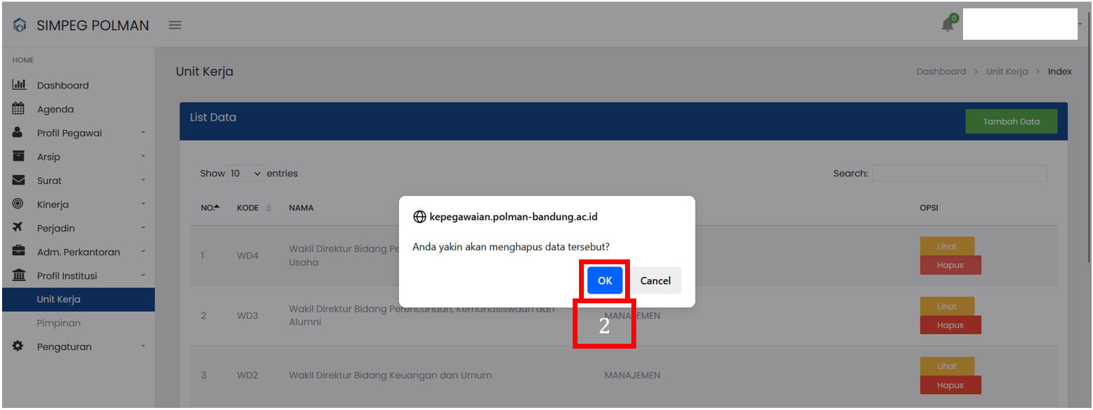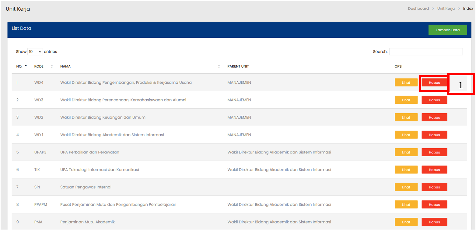 Pilih tombol Hapus pada baris data Unit Kerja yang ingin dihapus |