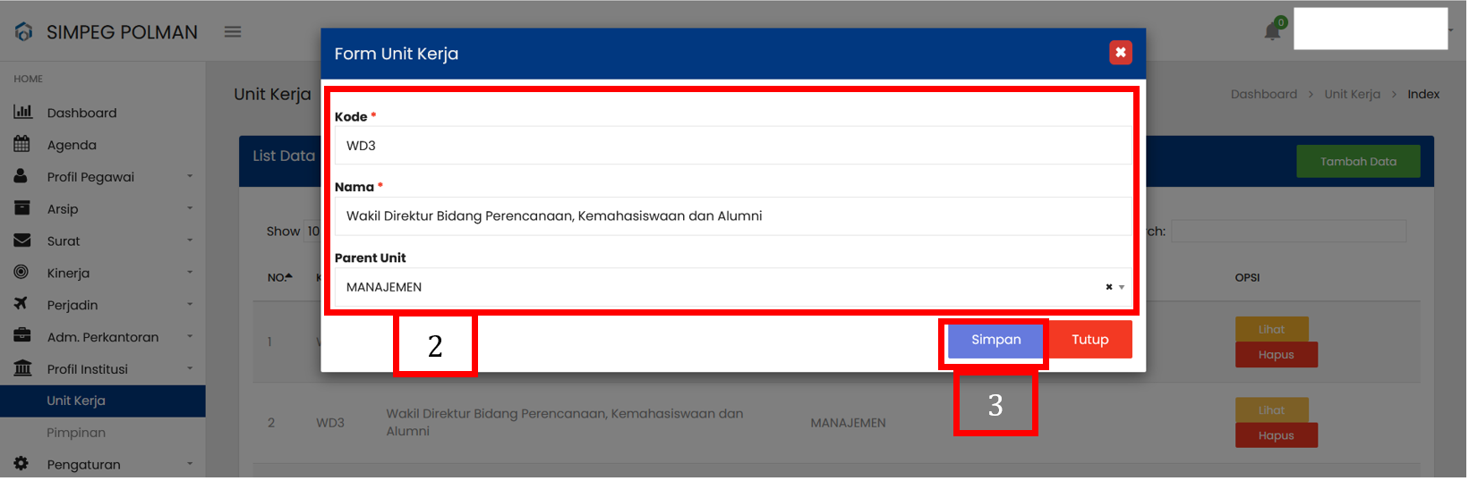 Pilih tombol Simpan untuk menyimpan data Unit Kerja |