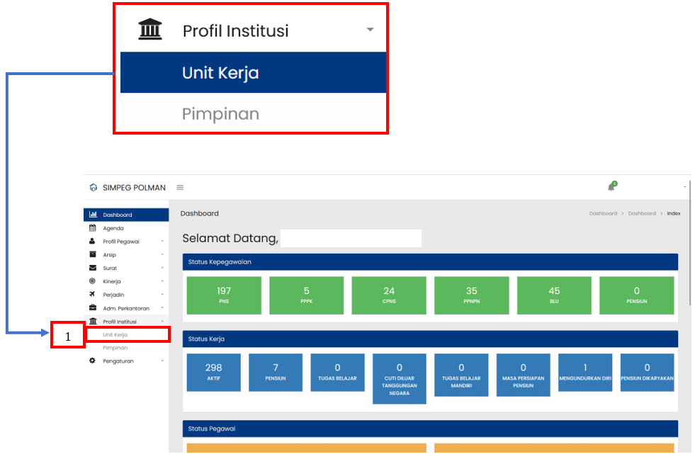 Profil Institusi merupakan salah satu menu dalam Sistem Informasi Kepegawaian yang berisi data mengenai Unit Kerja dan Pimpinan Unit Kerja. Melalui menu ini, Pengelola Kepegawaian dapat melihat, menambahkan, mengubah dan menghapus data Unit Kerja serta Pimpinan Unit Kerja.