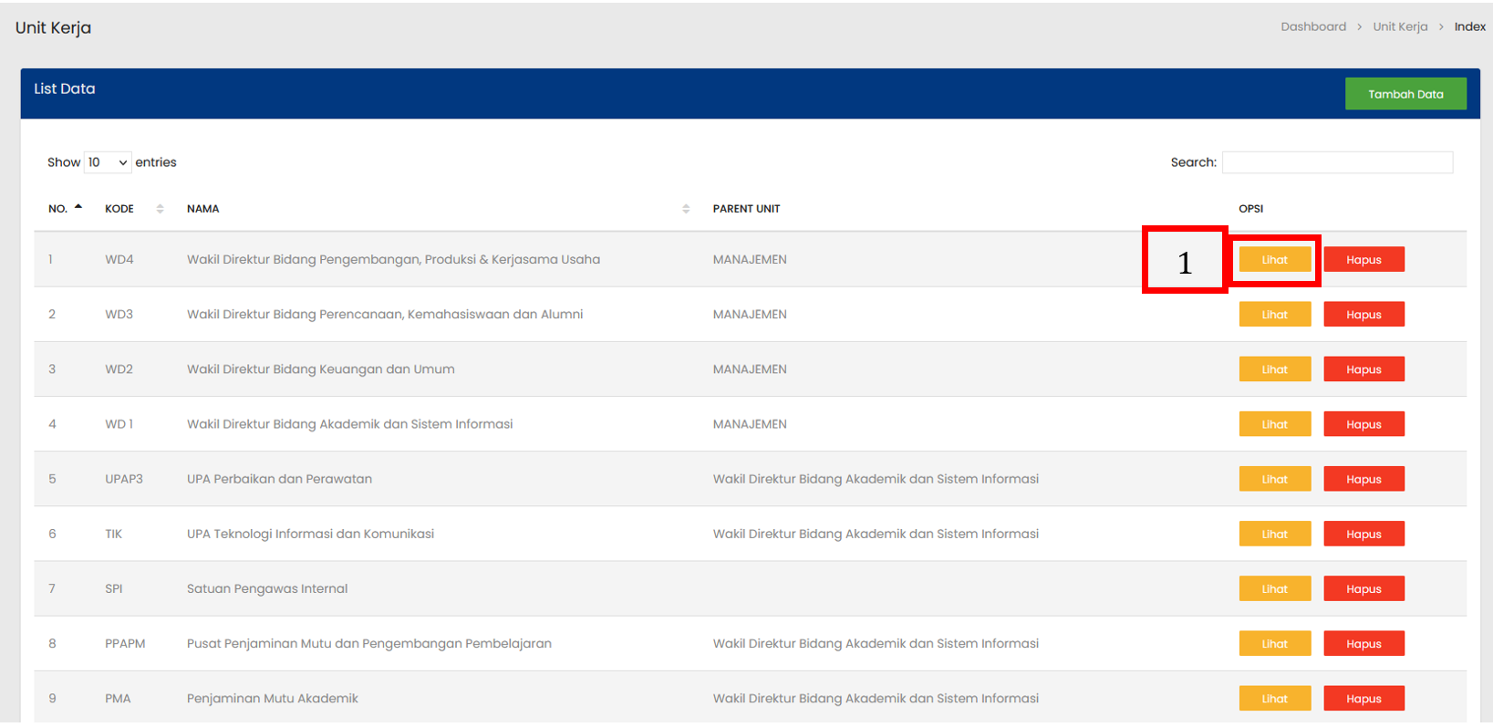 Tombol Lihat digunakan untuk melihat atau mengubah rincian dari Unit Kerja yang dipilih |