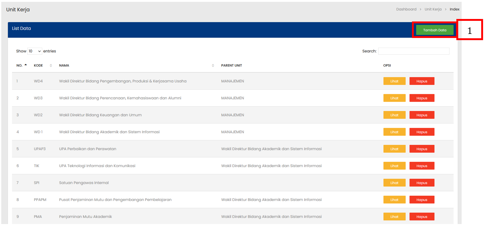 Pilih tombol Tambah Data untuk menampilkan form penambahan Unit Kerja baru |
