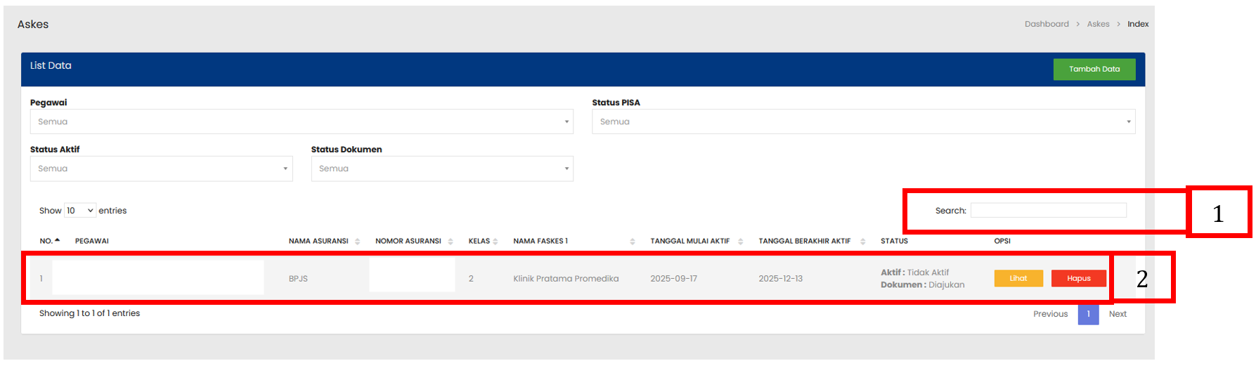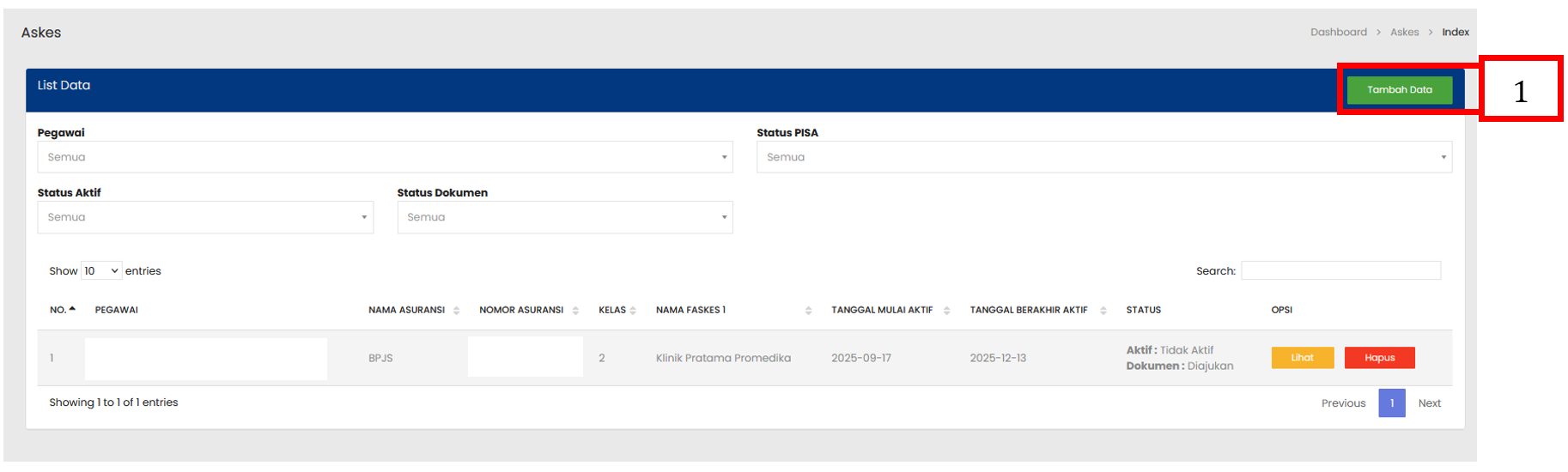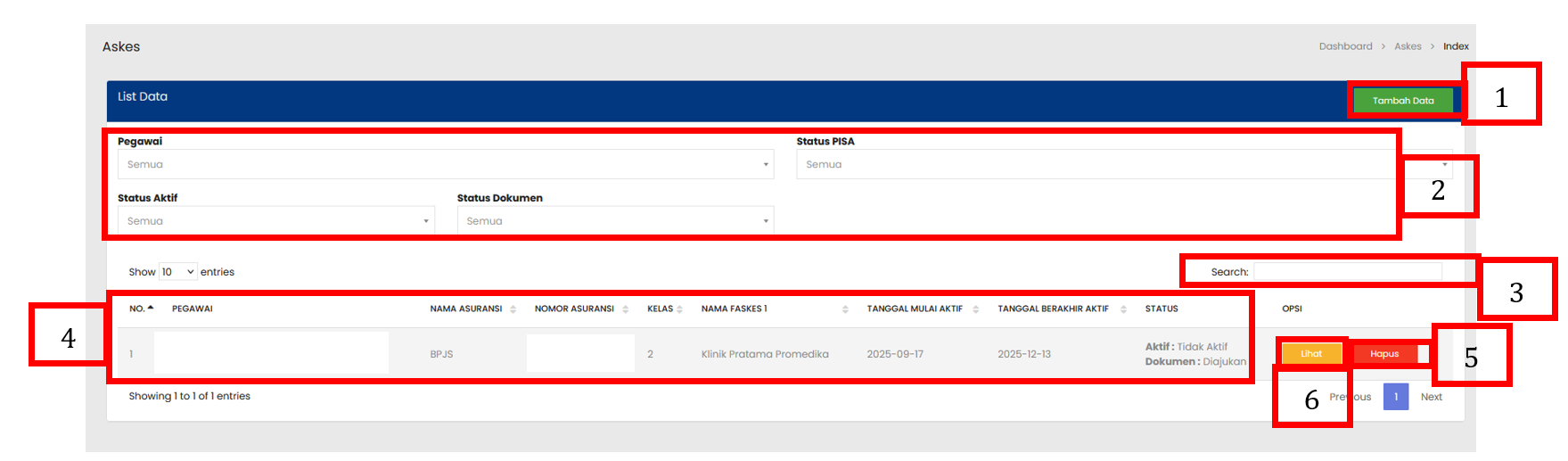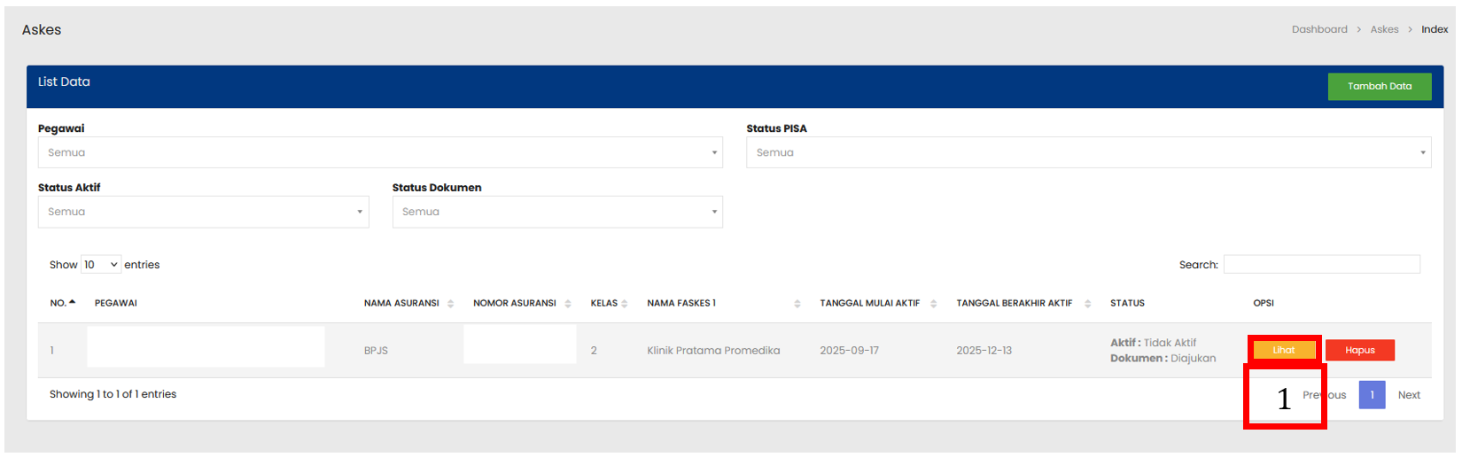 Tabel Askes menampilkan daftar seluruh Askes yang sudah terdaftar |