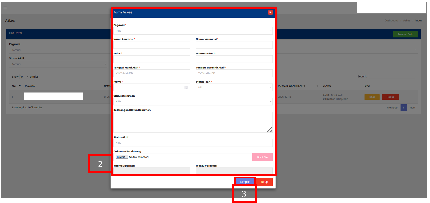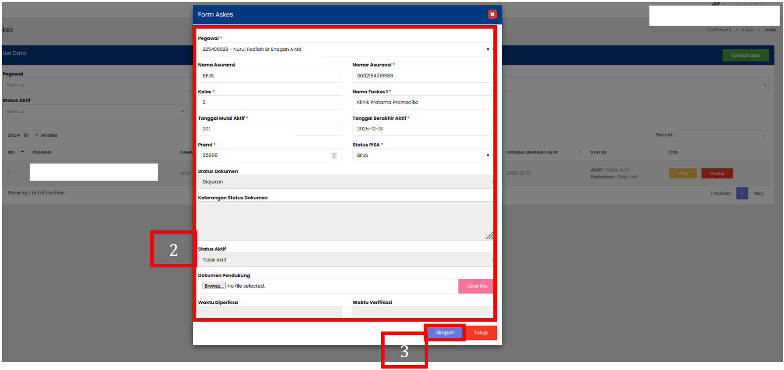 Isi form penambahan data sesuai dengan informasi Askes yang dibutuhkan. Pegawai : nama pegawai yang bersangkutan Nama Asuransi : nama perusahaan/penyedia asuransi Nomor Asuransi : nomor polis/keanggotaan asuransi Kelas : kelas asuransi/kelas perawatan (misalnya: Kelas I, II, III) Nama Faskes 1 : nama fasilitas kesehatan tingkat pertama yang terdaftar Tanggal Mulai Aktif : tanggal mulai berlakunya kepesertaan asuransi Tanggal Berakhir Aktif : tanggal berakhirnya kepesertaan asuransi (jika ada) Premi : jumlah iuran/premi asuransi yang dibayarkan Status PISA : status peserta pada fasilitas kesehatan rujukan (misalnya: Pusat Informasi dan Sistem Administrasi) Status Dokumen : Lengkap / Belum Lengkap Keterangan Status Dokumen : catatan tambahan terkait dokumen (misalnya: “Kartu Asuransi sudah diupload”) Status Aktif : Aktif / Tidak Aktif Dokumen Pendukung : file dokumen tambahan (kartu asuransi, bukti pembayaran, dll.) Waktu Diperiksa : tanggal dan jam dokumen diperiksa Waktu Verifikasi : tanggal dan jam dokumen diverifikasi |