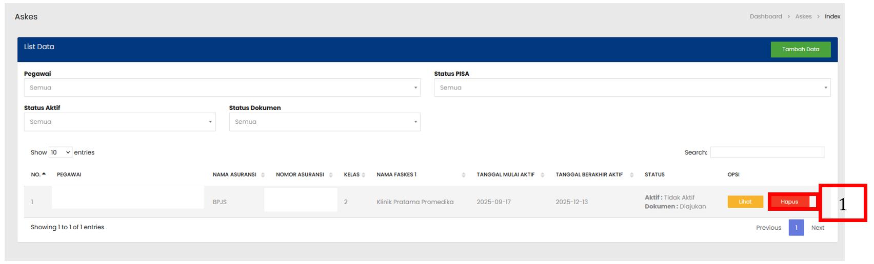 Pilih tombol Hapus pada baris data Askes yang ingin dihapus |