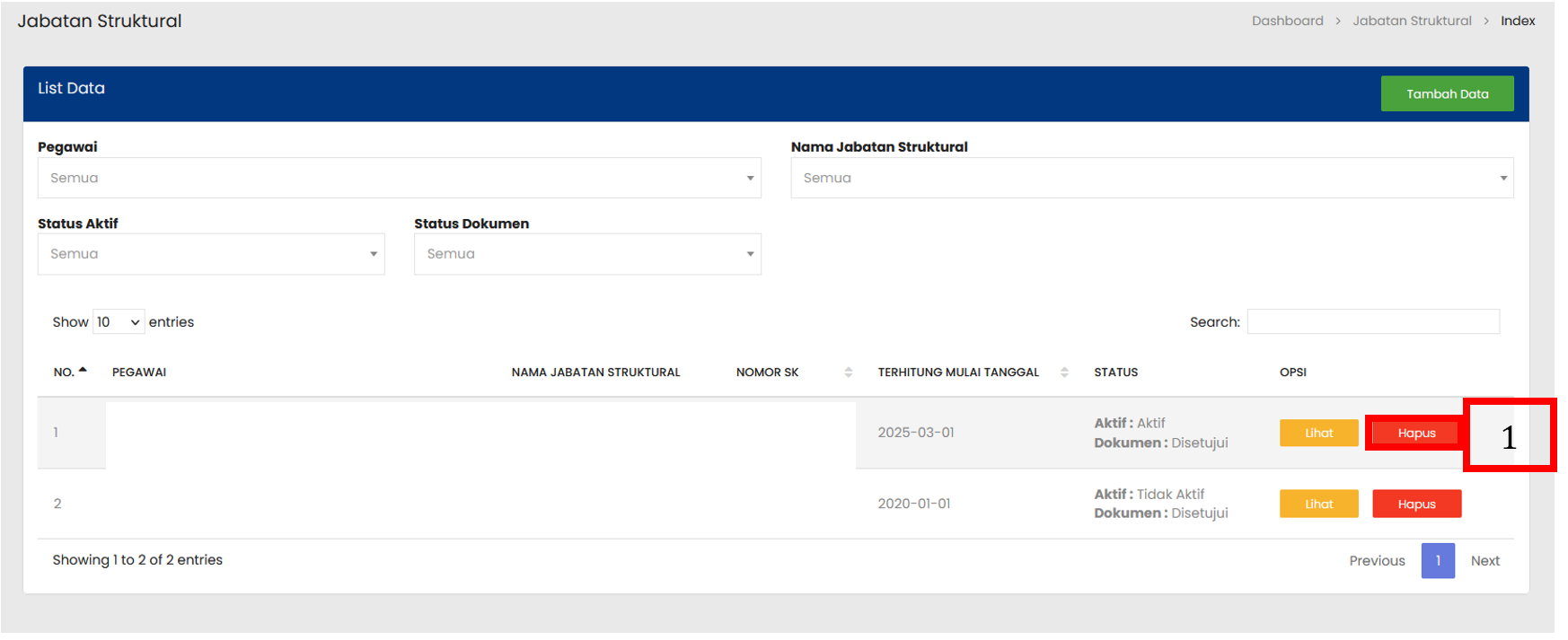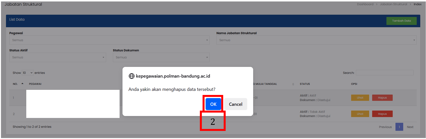 Pilih tombol Hapus pada baris data Jabatan Struktural yang ingin dihapus |