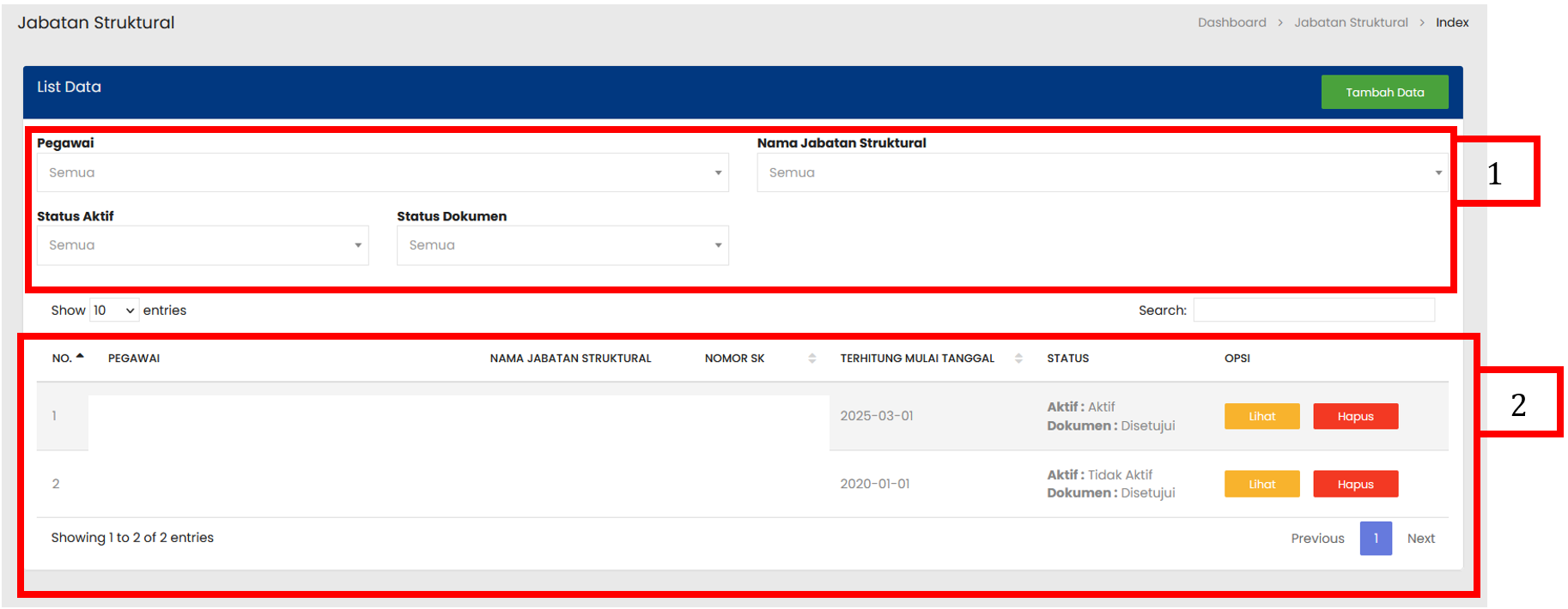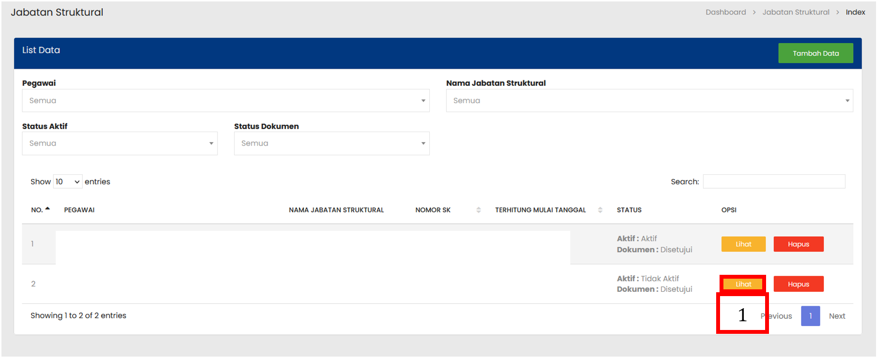 Pilih tombol Lihat untuk membuka rincian data Jabatan Struktural |