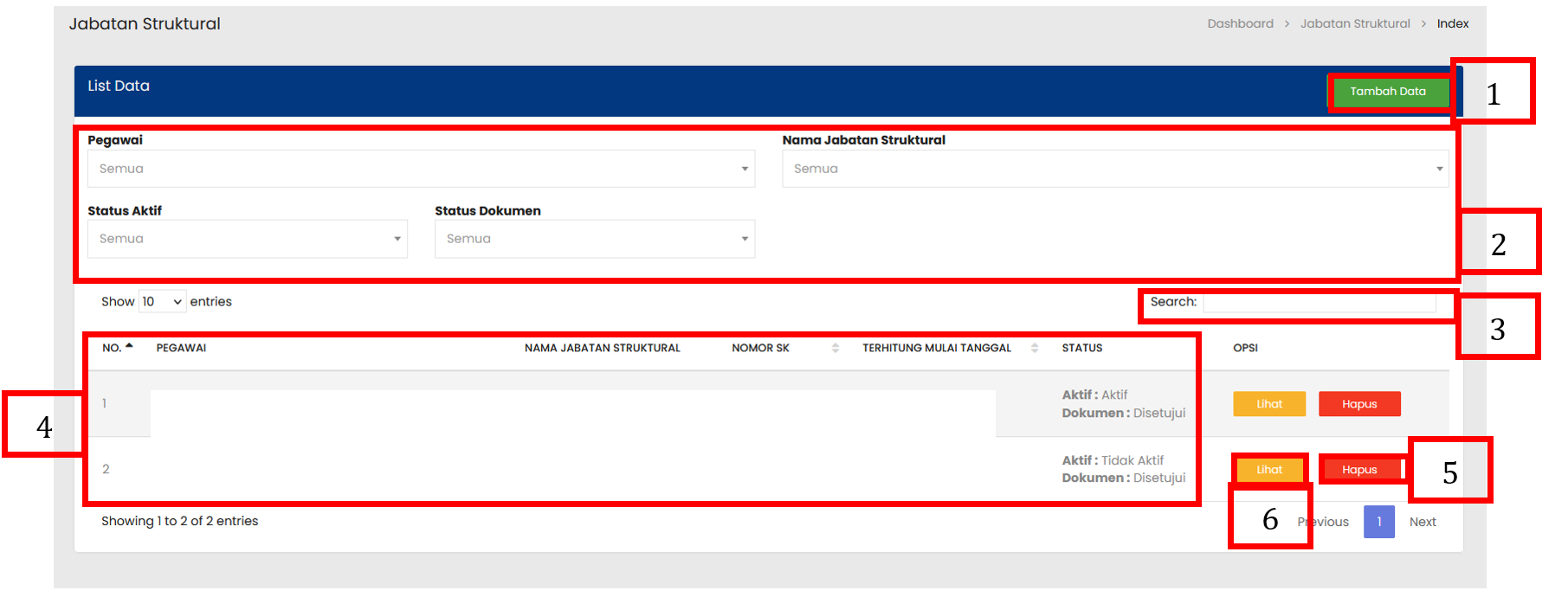 Tabel Jabatan Struktural menampilkan daftar seluruh Jabatan Struktural yang sudah terdaftar |