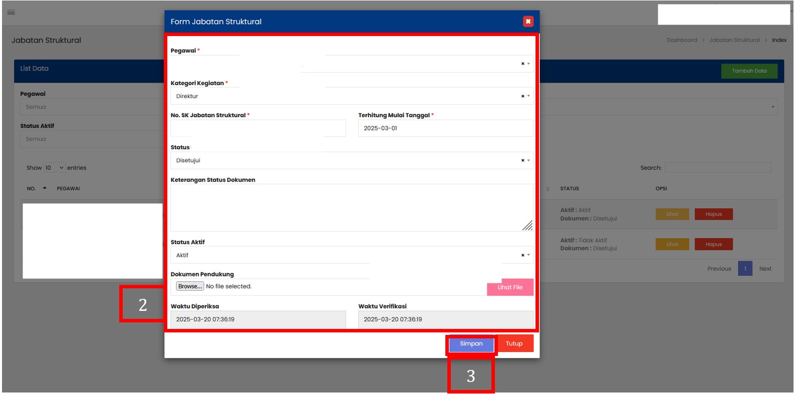 Isi form penambahan data sesuai dengan informasi Jabatan Struktural yang dibutuhkan. Pegawai : nama pegawai yang bersangkutan Kategori Kegiatan : nama jabatan Struktural yang dijabat oleh pegawai No. SK Jabatan Struktural : nomor surat keputusan (SK) pengangkatan jabatan Struktural Terhitung Mulai Tanggal : tanggal mulai berlaku jabatan Struktural sesuai SK Status Dokumen : Lengkap / Belum Lengkap Keterangan Status Dokumen : catatan tambahan terkait dokumen (misalnya: “SK Jabatan sudah diupload”) Status Aktif : Aktif / Tidak Aktif Dokumen Pendukung : file dokumen tambahan (SK, sertifikat, dll.) Waktu Diperiksa : tanggal dan jam dokumen diperiksa Waktu Verifikasi : tanggal dan jam dokumen diverifikasi |