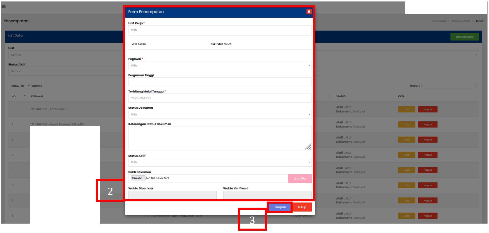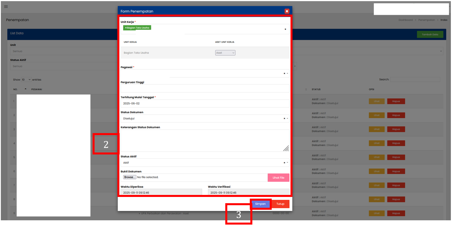 Isi form penambahan data sesuai dengan informasi Penempatan yang dibutuhkan. Unit Kerja : nama unit kerja tempat pegawai bertugas Pegawai : nama pegawai yang bersangkutan Perguruan Tinggi : nama perguruan tinggi tempat pegawai menempuh pendidikan (jika relevan) Terhitung Mulai Tanggal: tanggal mulai berlaku data sesuai SK/dokumen Status Dokumen : Lengkap / Belum Lengkap Keterangan Status Dokumen : catatan tambahan terkait dokumen (misalnya: “Ijazah sudah diupload”) Status Aktif : Aktif / Tidak Aktif Bukti Dokumen : file dokumen pendukung (ijazah, SK, sertifikat, dll.) Waktu Diperiksa : tanggal dan jam dokumen diperiksa Waktu Verifikasi : tanggal dan jam dokumen diverifikasi |