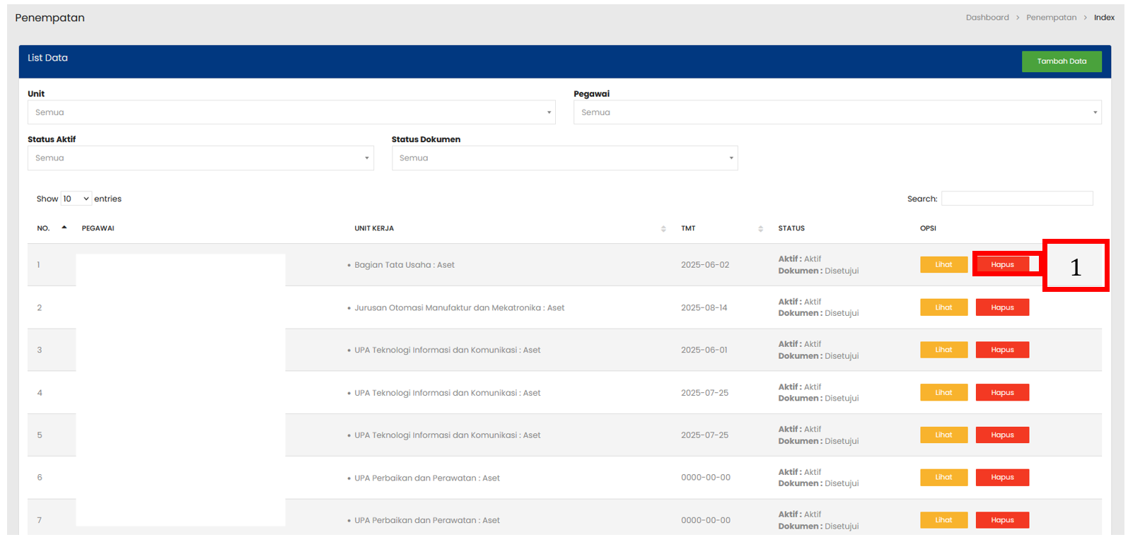 Pilih tombol Hapus pada baris data Penempatan yang ingin dihapus |