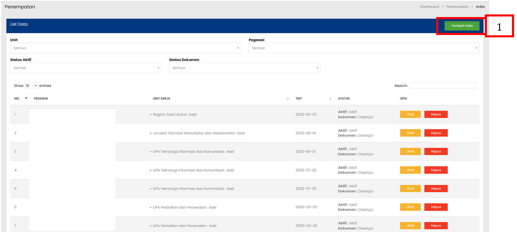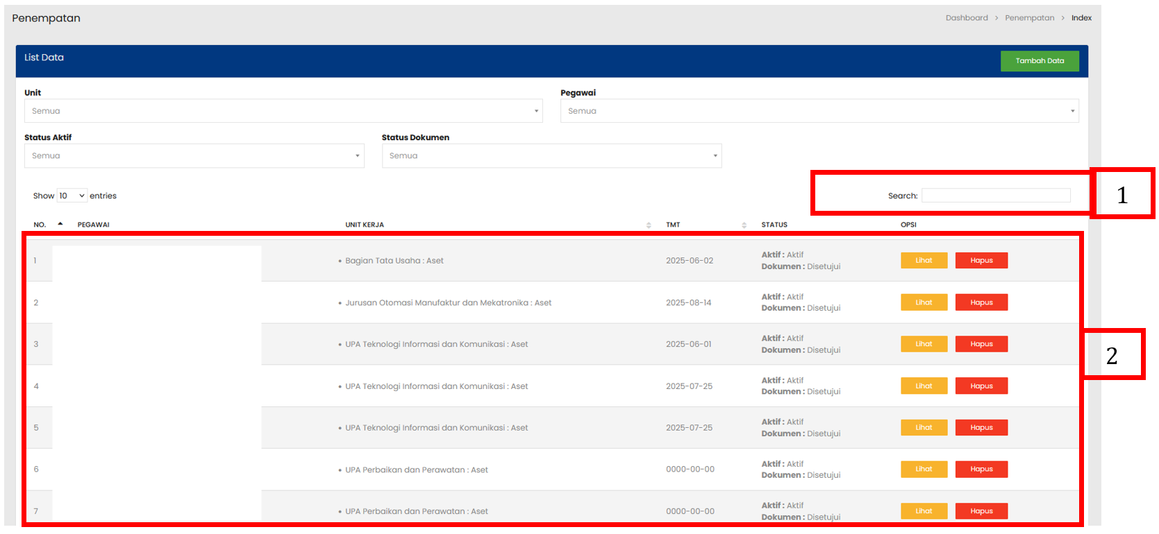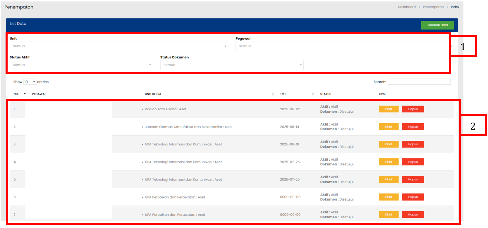 Tabel Penempatan menampilkan daftar seluruh Penempatan yang sudah terdaftar |