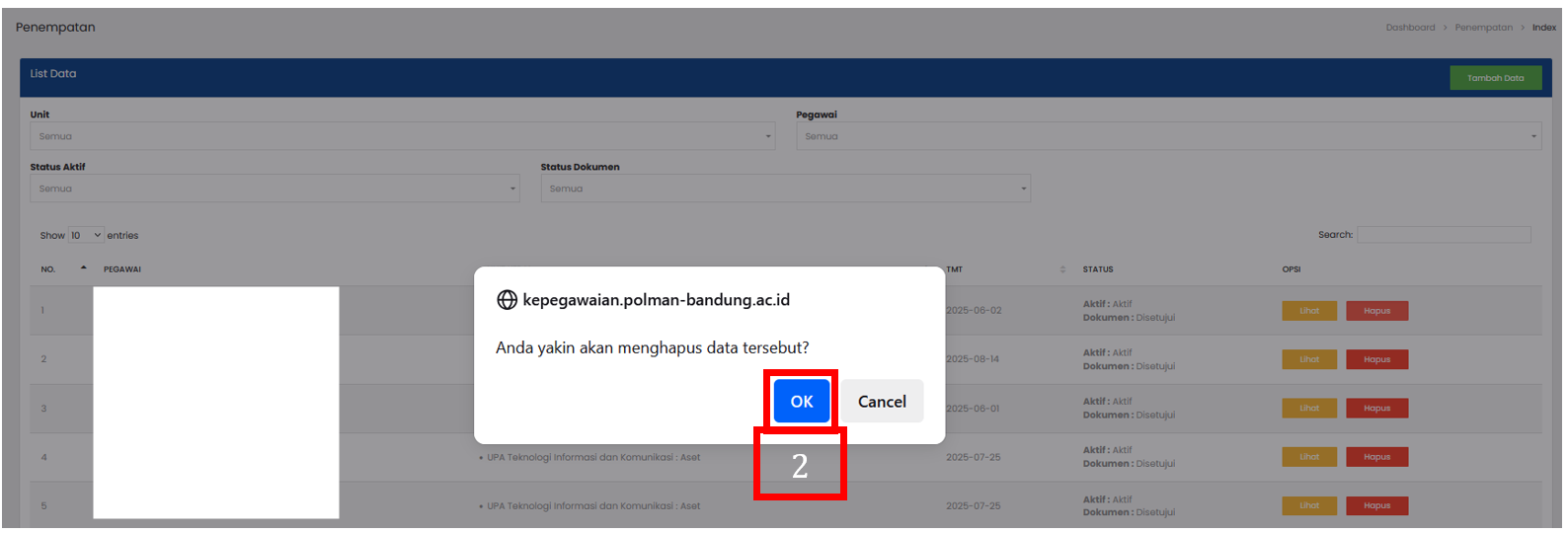 Pilih tombol OK pada pop-up konfirmasi untuk menyetujui penghapusan data |